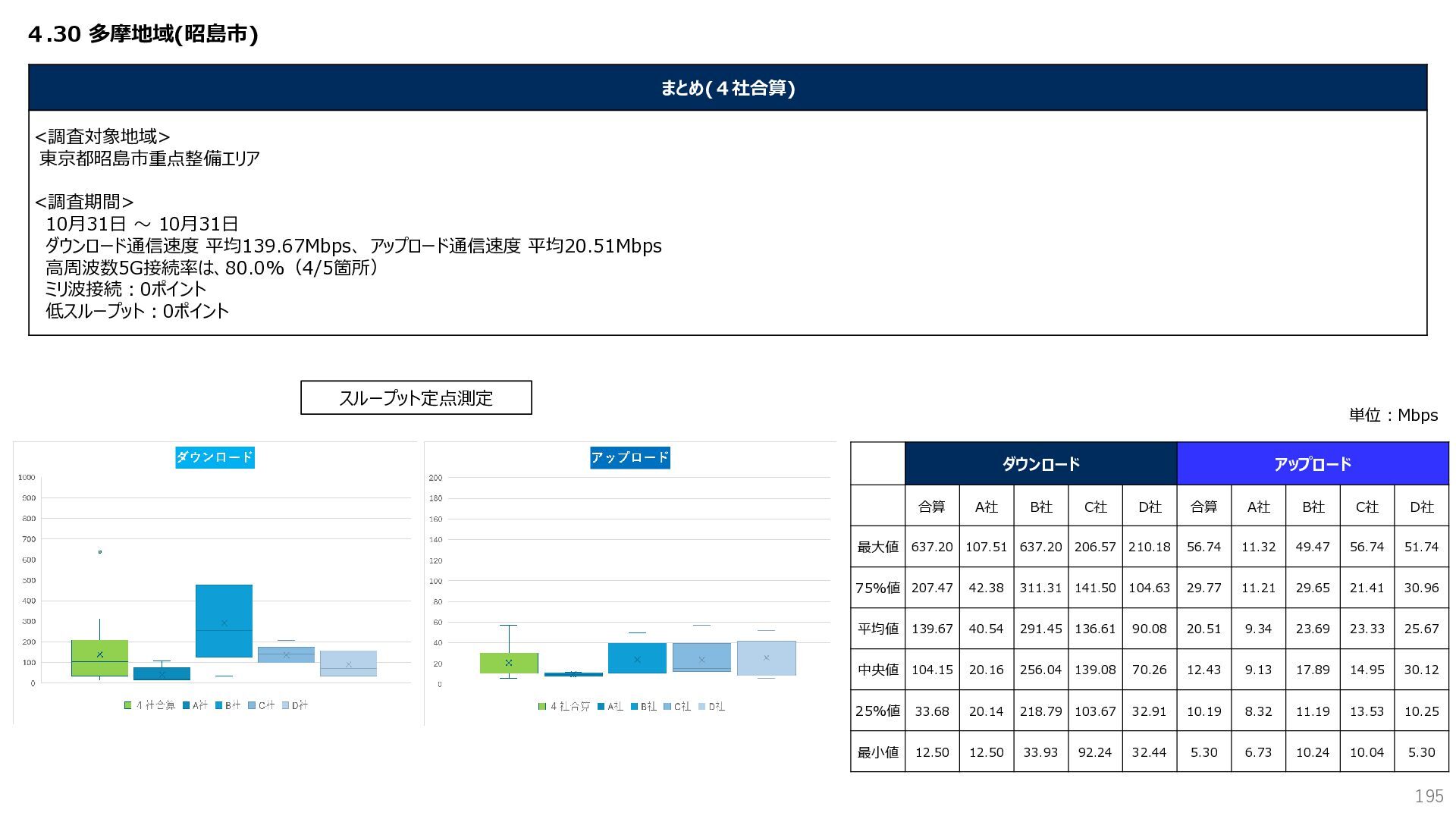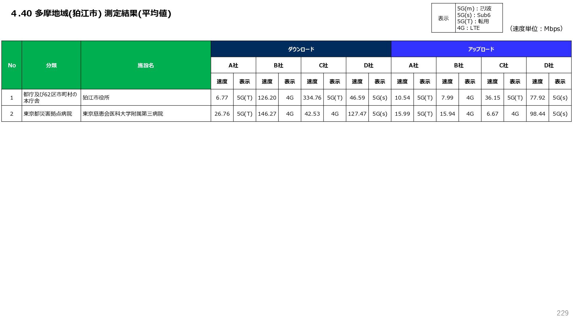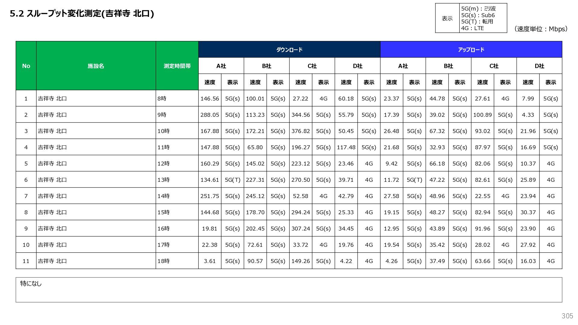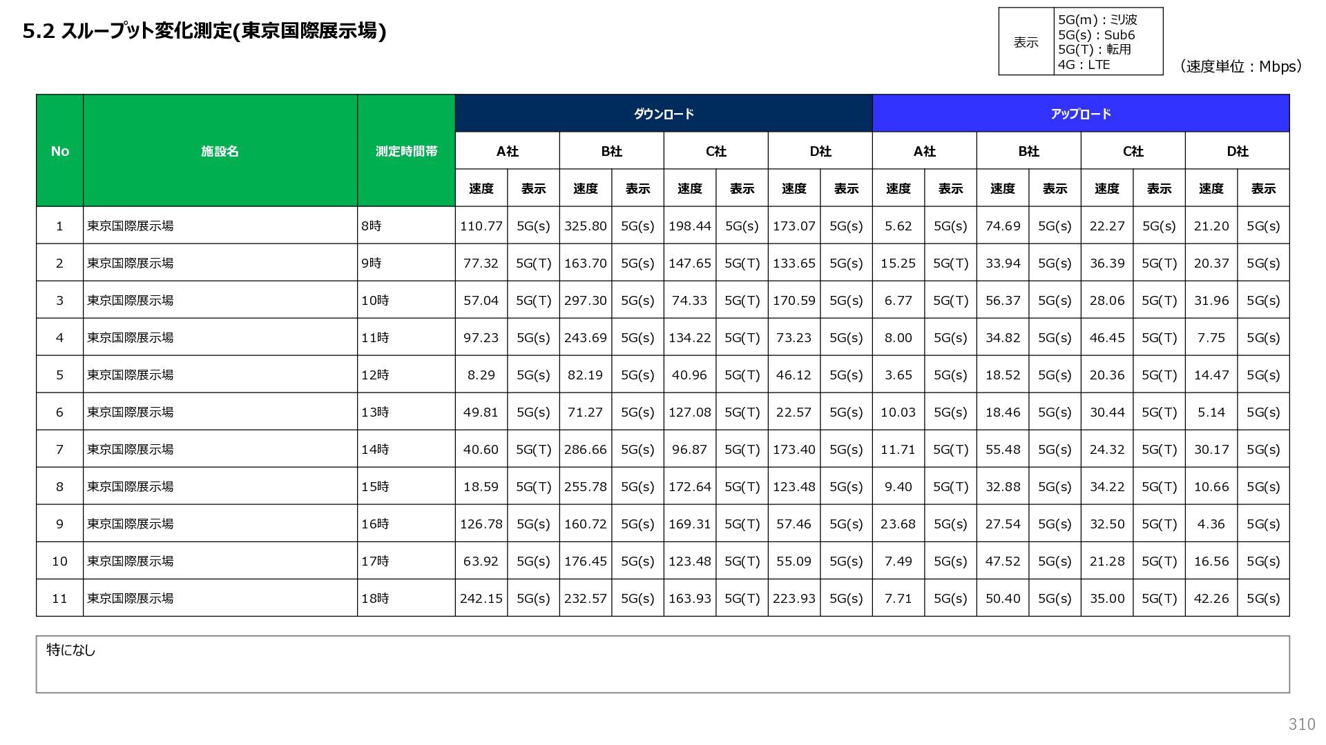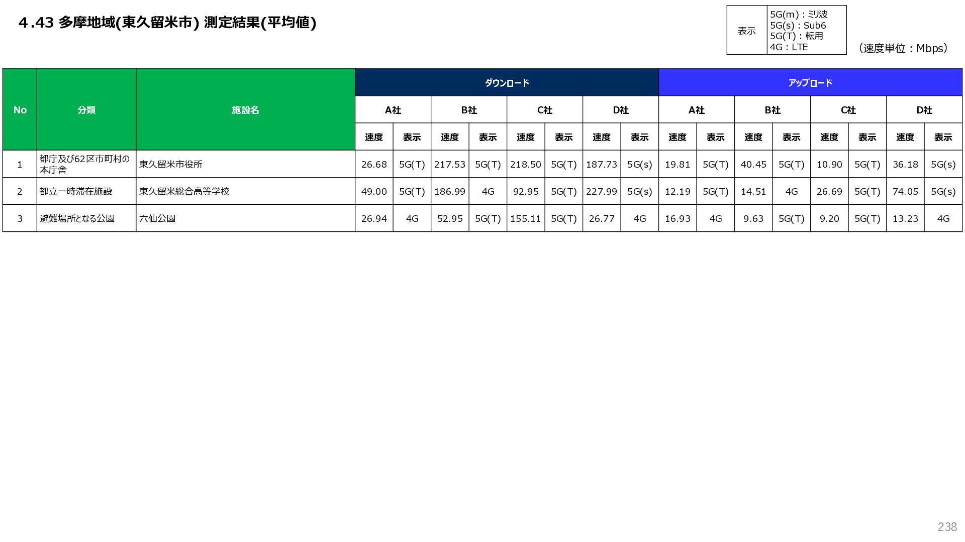 No 分類 施設名 ダウンロード アップロード A社 B社 C社 D社 A社 B社 C社 D社 速度 表示 速度 表示 速度 表示 速度 表示 速度 表示 速度 表示 速度 表示 速度 表示 181 駅及び羽田空港 赤坂見附駅(A赤坂3丁目) 244.11 5G(s) 312.06 5G(s) 553.68 5G(s) 280.58 5G(s) 33.51 5G(s) 27.42 5G(s) 141.19 5G(s) 34.18 5G(s) 182 駅及び羽田空港 赤坂見附駅(出口11) 274.09 5G(s) 142.07 5G(s) 449.05 5G(s) 51.54 5G(s) 8.60 5G(s) 56.96 5G(s) 133.23 5G(s) 6.18 5G(s) 183 駅及び羽田空港 中野坂上駅(出口1) 93.93 5G(T) 413.57 5G(T) 122.56 5G(T) 334.71 5G(m) 4.40 5G(T) 30.20 5G(T) 18.98 5G(T) 61.05 5G(m) 184 駅及び羽田空港 中野坂上駅(出口A2) 10.50 5G(s) 345.78 5G(s) 117.08 5G(T) 107.31 5G(s) 10.16 5G(s) 61.12 5G(s) 9.13 5G(T) 86.43 5G(s) 185 駅及び羽田空港 馬喰横山駅(出口1) 854.65 5G(s) 108.89 5G(s) 232.08 5G(m) 63.27 5G(s) 21.22 5G(s) 24.17 5G(s) 51.05 5G(m) 17.94 5G(s) 186 駅及び羽田空港 馬喰横山駅(出口A3) 206.87 5G(s) 968.72 5G(s) 10.64 5G(s) 35.08 5G(s) 15.76 5G(s) 143.06 5G(s) 68.96 5G(s) 34.89 5G(s) 187 駅及び羽田空港 大塚駅(北口) 43.53 5G(T) 847.90 5G(s) 186.89 5G(T) 60.82 5G(s) 26.25 5G(T) 150.29 5G(s) 35.04 5G(T) 70.17 5G(s) 188 駅及び羽田空港 大塚駅(南口) 15.47 5G(T) 1173.87 5G(s) 109.80 5G(T) 87.14 5G(s) 25.79 5G(T) 476.11 5G(s) 15.45 5G(T) 39.40 5G(s) 189 駅及び羽田空港 溜池山王駅(出口11) 92.40 5G(s) 403.44 5G(s) 472.42 5G(s) 55.40 5G(s) 13.09 5G(s) 53.36 5G(s) 90.48 5G(s) 4.36 5G(s) 190 駅及び羽田空港 溜池山王駅(出口5) 505.11 5G(s) 172.57 5G(s) 219.49 5G(s) 158.24 5G(s) 52.33 5G(s) 17.32 5G(s) 94.70 5G(s) 30.15 5G(s) 191 駅及び羽田空港 両国駅(東口) 302.46 5G(s) 125.33 5G(s) 69.06 5G(T) 57.41 5G(s) 8.65 5G(s) 29.32 5G(s) 34.20 5G(T) 17.95 5G(s) 192 駅及び羽田空港 両国駅(西口) 23.52 5G(s) 298.77 5G(s) 93.29 5G(T) 122.09 5G(s) 3.72 5G(s) 62.49 5G(s) 40.80 5G(T) 35.44 5G(s) 193 駅及び羽田空港 明治神宮前駅(4) 245.03 5G(s) 654.16 5G(m) 25.81 5G(T) 67.27 5G(s) 17.16 5G(s) 129.38 5G(m) 33.04 5G(T) 7.55 5G(s) 194 駅及び羽田空港 明治神宮前駅(1) 297.55 5G(s) 585.23 5G(m) 394.00 5G(s) 147.79 5G(s) 34.34 5G(s) 246.05 5G(m) 56.49 5G(s) 9.69 5G(s) 195 駅及び羽田空港 明大前駅(中央口) 244.72 5G(s) 41.49 4G 179.86 5G(T) 90.30 5G(s) 37.01 5G(s) 3.05 4G 37.59 5G(T) 41.14 5G(s) 196 駅及び羽田空港 明大前駅(フレンテ口) 77.75 5G(s) 359.64 5G(s) 140.30 5G(T) 83.94 5G(s) 42.60 5G(s) 60.21 5G(s) 30.28 5G(T) 45.83 5G(s) 197 駅及び羽田空港 東中野駅(西口) 39.24 5G(T) 233.33 5G(T) 193.21 5G(T) 70.45 5G(s) 29.19 5G(T) 60.83 5G(T) 13.88 5G(T) 55.17 5G(s) 198 駅及び羽田空港 東中野駅(東口) 46.14 5G(T) 119.89 4G 248.33 5G(s) 36.70 4G 34.95 5G(T) 14.32 4G 30.22 5G(s) 51.07 4G 199 駅及び羽田空港 虎ノ門駅(B2) 212.89 5G(s) 95.53 5G(s) 456.84 5G(s) 84.28 5G(s) 18.76 5G(s) 19.05 5G(s) 55.94 5G(s) 6.59 5G(s) 200 駅及び羽田空港 虎ノ門駅(5) 153.89 5G(s) 467.33 5G(s) 274.51 5G(T) 169.44 5G(s) 24.37 5G(s) 61.55 5G(s) 41.85 5G(T) 70.61 5G(s)