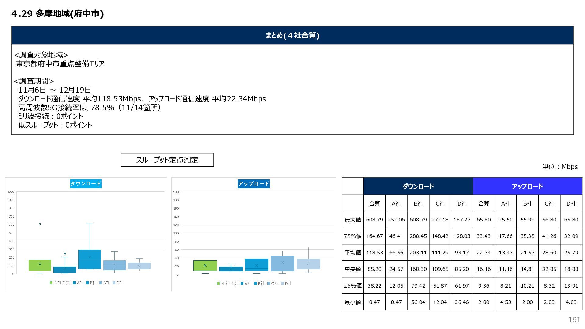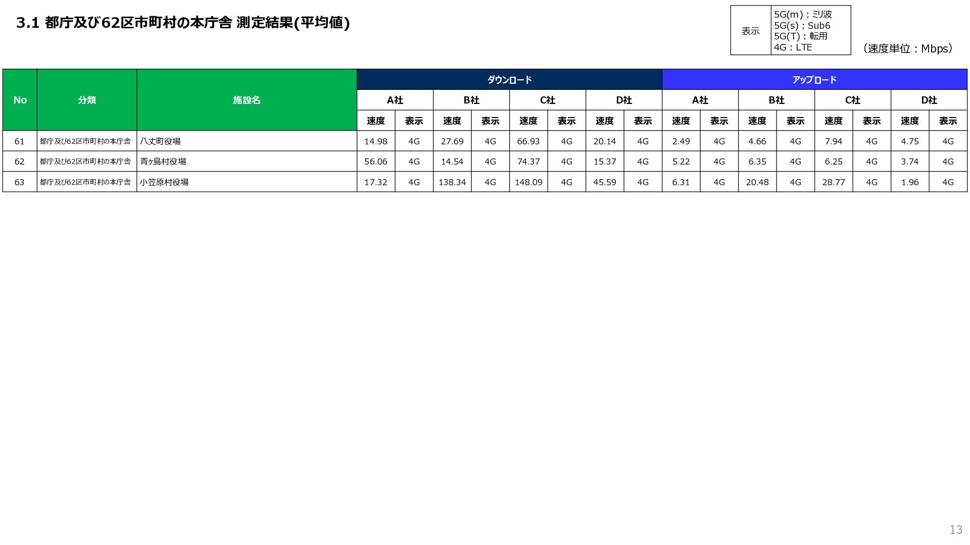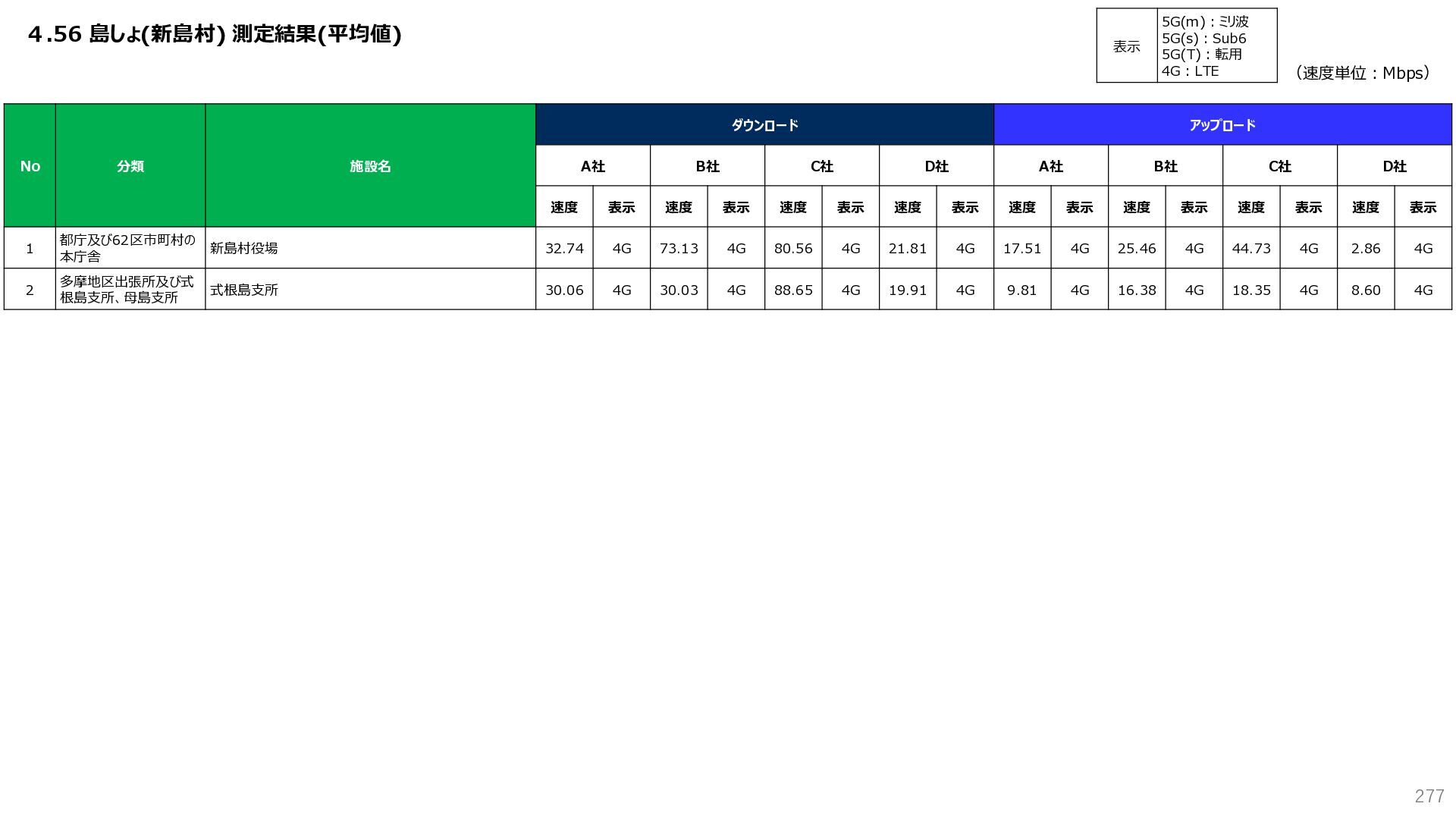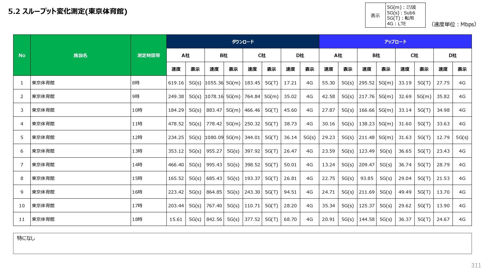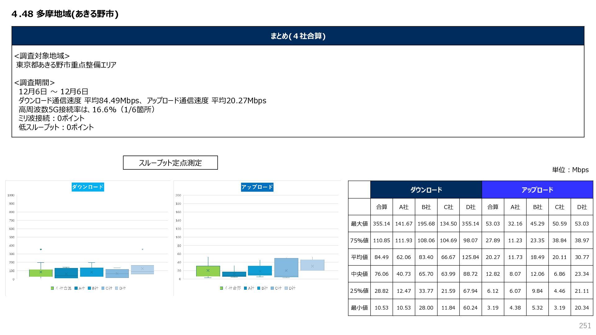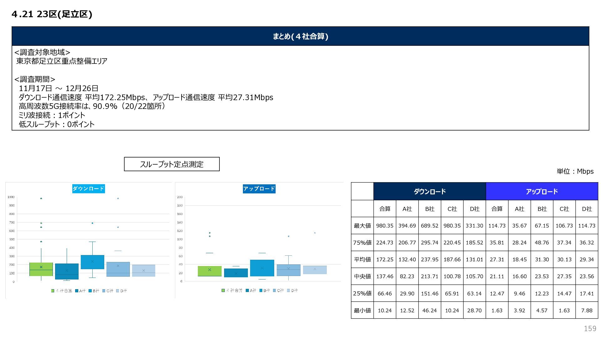 No 分類 施設名 ダウンロード アップロード A社 B社 C社 D社 A社 B社 C社 D社 速度 表示 速度 表示 速度 表示 速度 表示 速度 表示 速度 表示 速度 表示 速度 表示 181 駅及び羽田空港 赤坂見附駅(A赤坂3丁目) 244.11 5G(s) 312.06 5G(s) 553.68 5G(s) 280.58 5G(s) 33.51 5G(s) 27.42 5G(s) 141.19 5G(s) 34.18 5G(s) 182 駅及び羽田空港 赤坂見附駅(出口11) 274.09 5G(s) 142.07 5G(s) 449.05 5G(s) 51.54 5G(s) 8.60 5G(s) 56.96 5G(s) 133.23 5G(s) 6.18 5G(s) 183 駅及び羽田空港 中野坂上駅(出口1) 93.93 5G(T) 413.57 5G(T) 122.56 5G(T) 334.71 5G(m) 4.40 5G(T) 30.20 5G(T) 18.98 5G(T) 61.05 5G(m) 184 駅及び羽田空港 中野坂上駅(出口A2) 10.50 5G(s) 345.78 5G(s) 117.08 5G(T) 107.31 5G(s) 10.16 5G(s) 61.12 5G(s) 9.13 5G(T) 86.43 5G(s) 185 駅及び羽田空港 馬喰横山駅(出口1) 854.65 5G(s) 108.89 5G(s) 232.08 5G(m) 63.27 5G(s) 21.22 5G(s) 24.17 5G(s) 51.05 5G(m) 17.94 5G(s) 186 駅及び羽田空港 馬喰横山駅(出口A3) 206.87 5G(s) 968.72 5G(s) 10.64 5G(s) 35.08 5G(s) 15.76 5G(s) 143.06 5G(s) 68.96 5G(s) 34.89 5G(s) 187 駅及び羽田空港 大塚駅(北口) 43.53 5G(T) 847.90 5G(s) 186.89 5G(T) 60.82 5G(s) 26.25 5G(T) 150.29 5G(s) 35.04 5G(T) 70.17 5G(s) 188 駅及び羽田空港 大塚駅(南口) 15.47 5G(T) 1173.87 5G(s) 109.80 5G(T) 87.14 5G(s) 25.79 5G(T) 476.11 5G(s) 15.45 5G(T) 39.40 5G(s) 189 駅及び羽田空港 溜池山王駅(出口11) 92.40 5G(s) 403.44 5G(s) 472.42 5G(s) 55.40 5G(s) 13.09 5G(s) 53.36 5G(s) 90.48 5G(s) 4.36 5G(s) 190 駅及び羽田空港 溜池山王駅(出口5) 505.11 5G(s) 172.57 5G(s) 219.49 5G(s) 158.24 5G(s) 52.33 5G(s) 17.32 5G(s) 94.70 5G(s) 30.15 5G(s) 191 駅及び羽田空港 両国駅(東口) 302.46 5G(s) 125.33 5G(s) 69.06 5G(T) 57.41 5G(s) 8.65 5G(s) 29.32 5G(s) 34.20 5G(T) 17.95 5G(s) 192 駅及び羽田空港 両国駅(西口) 23.52 5G(s) 298.77 5G(s) 93.29 5G(T) 122.09 5G(s) 3.72 5G(s) 62.49 5G(s) 40.80 5G(T) 35.44 5G(s) 193 駅及び羽田空港 明治神宮前駅(4) 245.03 5G(s) 654.16 5G(m) 25.81 5G(T) 67.27 5G(s) 17.16 5G(s) 129.38 5G(m) 33.04 5G(T) 7.55 5G(s) 194 駅及び羽田空港 明治神宮前駅(1) 297.55 5G(s) 585.23 5G(m) 394.00 5G(s) 147.79 5G(s) 34.34 5G(s) 246.05 5G(m) 56.49 5G(s) 9.69 5G(s) 195 駅及び羽田空港 明大前駅(中央口) 244.72 5G(s) 41.49 4G 179.86 5G(T) 90.30 5G(s) 37.01 5G(s) 3.05 4G 37.59 5G(T) 41.14 5G(s) 196 駅及び羽田空港 明大前駅(フレンテ口) 77.75 5G(s) 359.64 5G(s) 140.30 5G(T) 83.94 5G(s) 42.60 5G(s) 60.21 5G(s) 30.28 5G(T) 45.83 5G(s) 197 駅及び羽田空港 東中野駅(西口) 39.24 5G(T) 233.33 5G(T) 193.21 5G(T) 70.45 5G(s) 29.19 5G(T) 60.83 5G(T) 13.88 5G(T) 55.17 5G(s) 198 駅及び羽田空港 東中野駅(東口) 46.14 5G(T) 119.89 4G 248.33 5G(s) 36.70 4G 34.95 5G(T) 14.32 4G 30.22 5G(s) 51.07 4G 199 駅及び羽田空港 虎ノ門駅(B2) 212.89 5G(s) 95.53 5G(s) 456.84 5G(s) 84.28 5G(s) 18.76 5G(s) 19.05 5G(s) 55.94 5G(s) 6.59 5G(s) 200 駅及び羽田空港 虎ノ門駅(5) 153.89 5G(s) 467.33 5G(s) 274.51 5G(T) 169.44 5G(s) 24.37 5G(s) 61.55 5G(s) 41.85 5G(T) 70.61 5G(s)
