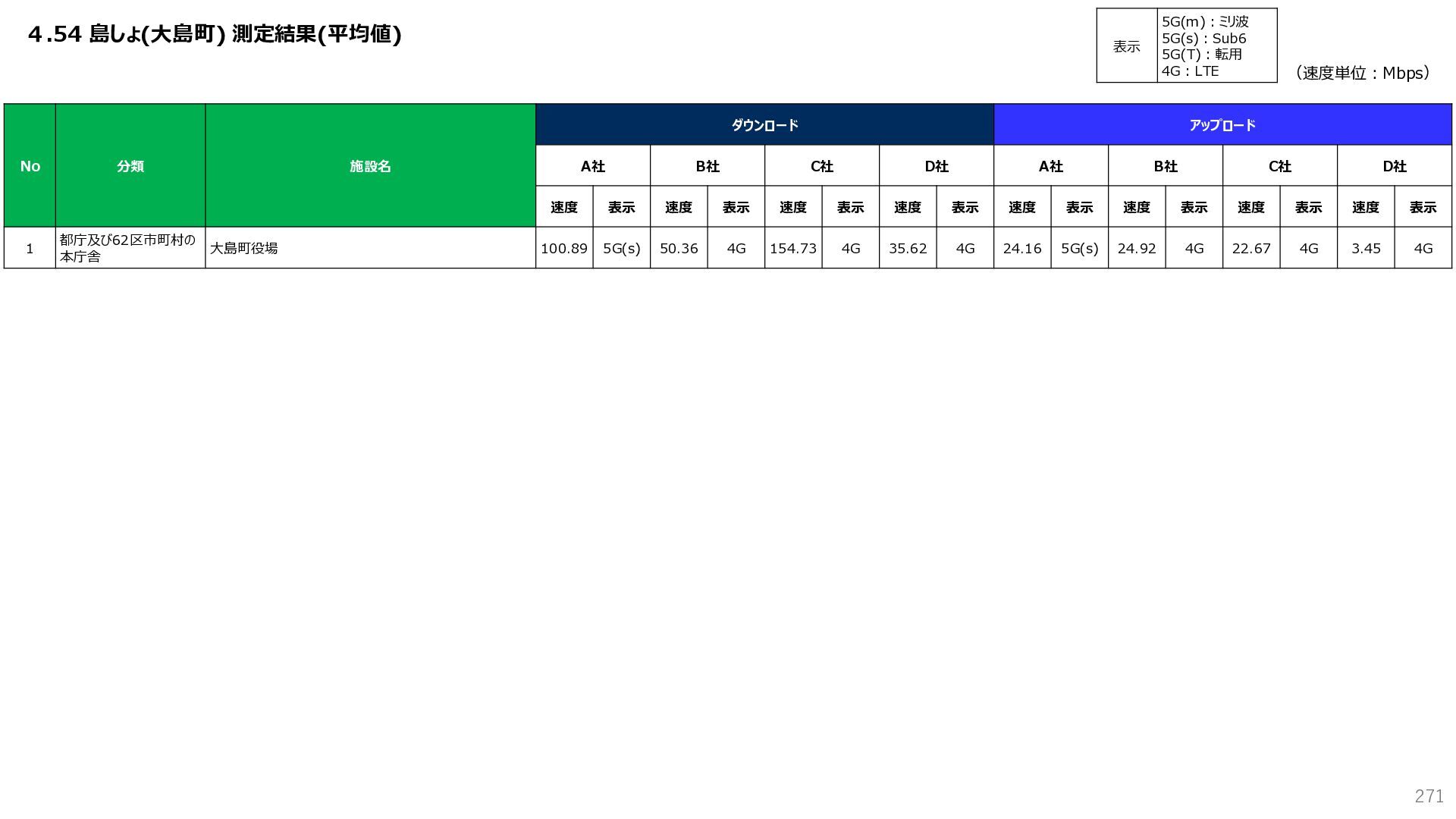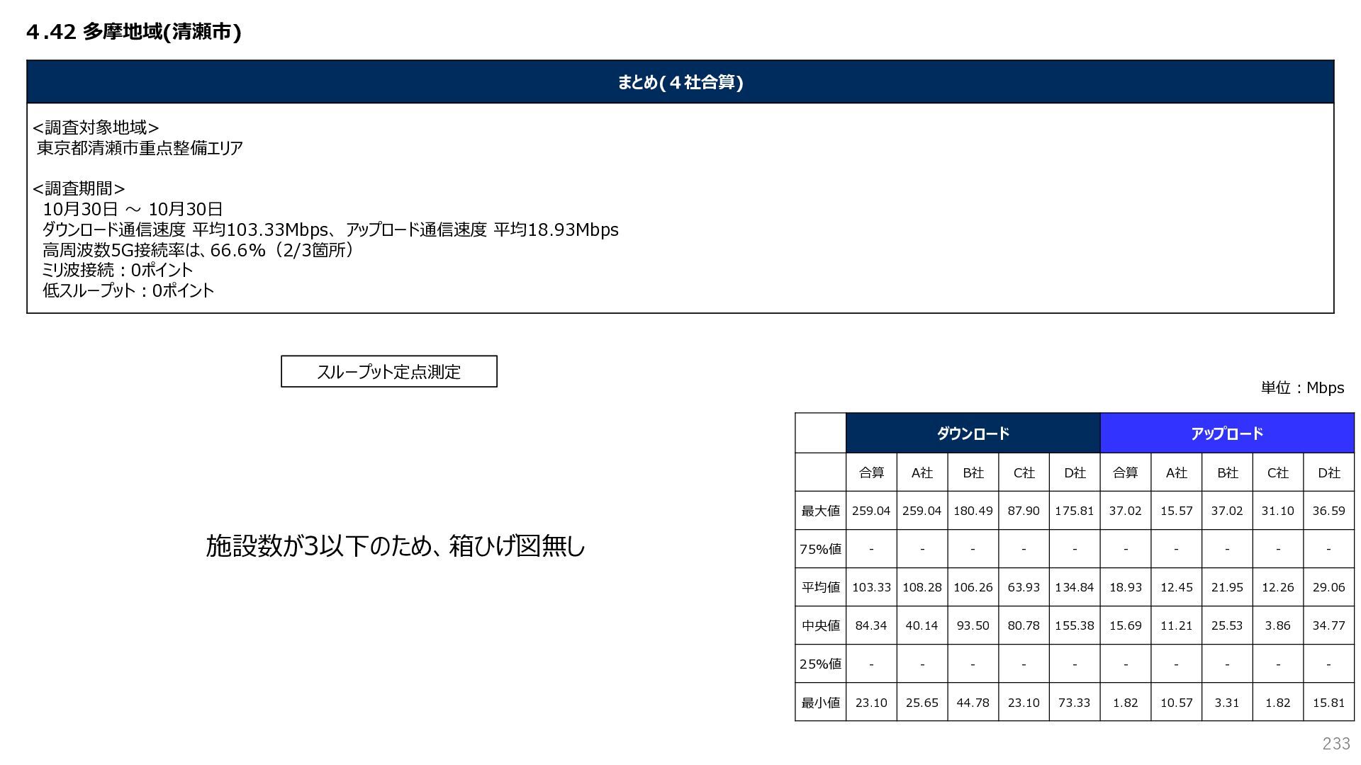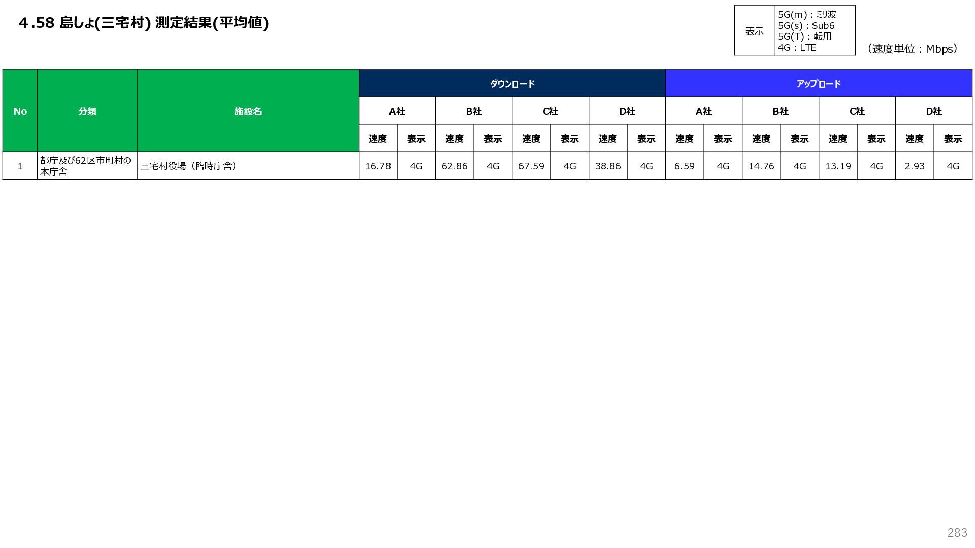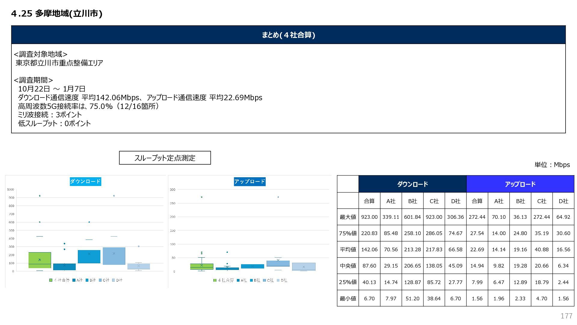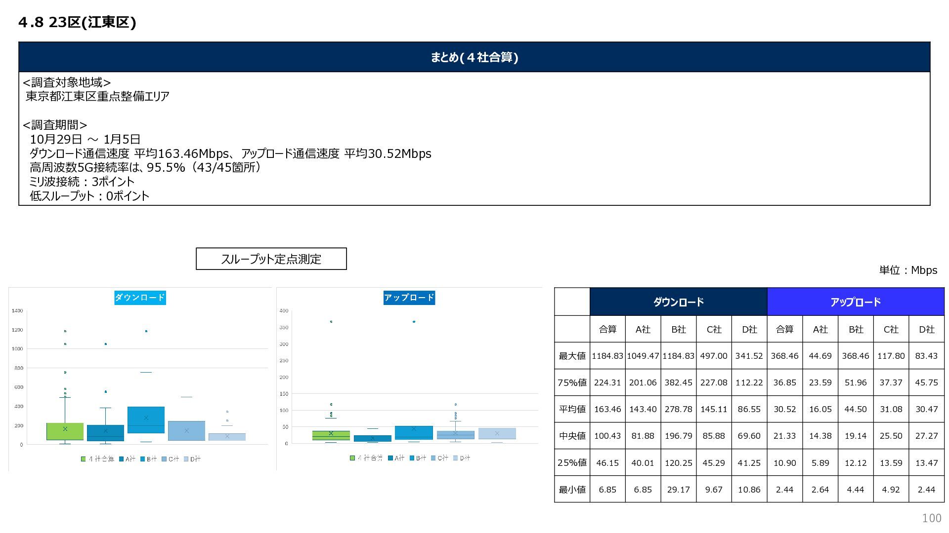 No 分類 施設名 ダウンロード アップロード A社 B社 C社 D社 A社 B社 C社 D社 速度 表示 速度 表示 速度 表示 速度 表示 速度 表示 速度 表示 速度 表示 速度 表示 181 駅及び羽田空港 赤坂見附駅(A赤坂3丁目) 244.11 5G(s) 312.06 5G(s) 553.68 5G(s) 280.58 5G(s) 33.51 5G(s) 27.42 5G(s) 141.19 5G(s) 34.18 5G(s) 182 駅及び羽田空港 赤坂見附駅(出口11) 274.09 5G(s) 142.07 5G(s) 449.05 5G(s) 51.54 5G(s) 8.60 5G(s) 56.96 5G(s) 133.23 5G(s) 6.18 5G(s) 183 駅及び羽田空港 中野坂上駅(出口1) 93.93 5G(T) 413.57 5G(T) 122.56 5G(T) 334.71 5G(m) 4.40 5G(T) 30.20 5G(T) 18.98 5G(T) 61.05 5G(m) 184 駅及び羽田空港 中野坂上駅(出口A2) 10.50 5G(s) 345.78 5G(s) 117.08 5G(T) 107.31 5G(s) 10.16 5G(s) 61.12 5G(s) 9.13 5G(T) 86.43 5G(s) 185 駅及び羽田空港 馬喰横山駅(出口1) 854.65 5G(s) 108.89 5G(s) 232.08 5G(m) 63.27 5G(s) 21.22 5G(s) 24.17 5G(s) 51.05 5G(m) 17.94 5G(s) 186 駅及び羽田空港 馬喰横山駅(出口A3) 206.87 5G(s) 968.72 5G(s) 10.64 5G(s) 35.08 5G(s) 15.76 5G(s) 143.06 5G(s) 68.96 5G(s) 34.89 5G(s) 187 駅及び羽田空港 大塚駅(北口) 43.53 5G(T) 847.90 5G(s) 186.89 5G(T) 60.82 5G(s) 26.25 5G(T) 150.29 5G(s) 35.04 5G(T) 70.17 5G(s) 188 駅及び羽田空港 大塚駅(南口) 15.47 5G(T) 1173.87 5G(s) 109.80 5G(T) 87.14 5G(s) 25.79 5G(T) 476.11 5G(s) 15.45 5G(T) 39.40 5G(s) 189 駅及び羽田空港 溜池山王駅(出口11) 92.40 5G(s) 403.44 5G(s) 472.42 5G(s) 55.40 5G(s) 13.09 5G(s) 53.36 5G(s) 90.48 5G(s) 4.36 5G(s) 190 駅及び羽田空港 溜池山王駅(出口5) 505.11 5G(s) 172.57 5G(s) 219.49 5G(s) 158.24 5G(s) 52.33 5G(s) 17.32 5G(s) 94.70 5G(s) 30.15 5G(s) 191 駅及び羽田空港 両国駅(東口) 302.46 5G(s) 125.33 5G(s) 69.06 5G(T) 57.41 5G(s) 8.65 5G(s) 29.32 5G(s) 34.20 5G(T) 17.95 5G(s) 192 駅及び羽田空港 両国駅(西口) 23.52 5G(s) 298.77 5G(s) 93.29 5G(T) 122.09 5G(s) 3.72 5G(s) 62.49 5G(s) 40.80 5G(T) 35.44 5G(s) 193 駅及び羽田空港 明治神宮前駅(4) 245.03 5G(s) 654.16 5G(m) 25.81 5G(T) 67.27 5G(s) 17.16 5G(s) 129.38 5G(m) 33.04 5G(T) 7.55 5G(s) 194 駅及び羽田空港 明治神宮前駅(1) 297.55 5G(s) 585.23 5G(m) 394.00 5G(s) 147.79 5G(s) 34.34 5G(s) 246.05 5G(m) 56.49 5G(s) 9.69 5G(s) 195 駅及び羽田空港 明大前駅(中央口) 244.72 5G(s) 41.49 4G 179.86 5G(T) 90.30 5G(s) 37.01 5G(s) 3.05 4G 37.59 5G(T) 41.14 5G(s) 196 駅及び羽田空港 明大前駅(フレンテ口) 77.75 5G(s) 359.64 5G(s) 140.30 5G(T) 83.94 5G(s) 42.60 5G(s) 60.21 5G(s) 30.28 5G(T) 45.83 5G(s) 197 駅及び羽田空港 東中野駅(西口) 39.24 5G(T) 233.33 5G(T) 193.21 5G(T) 70.45 5G(s) 29.19 5G(T) 60.83 5G(T) 13.88 5G(T) 55.17 5G(s) 198 駅及び羽田空港 東中野駅(東口) 46.14 5G(T) 119.89 4G 248.33 5G(s) 36.70 4G 34.95 5G(T) 14.32 4G 30.22 5G(s) 51.07 4G 199 駅及び羽田空港 虎ノ門駅(B2) 212.89 5G(s) 95.53 5G(s) 456.84 5G(s) 84.28 5G(s) 18.76 5G(s) 19.05 5G(s) 55.94 5G(s) 6.59 5G(s) 200 駅及び羽田空港 虎ノ門駅(5) 153.89 5G(s) 467.33 5G(s) 274.51 5G(T) 169.44 5G(s) 24.37 5G(s) 61.55 5G(s) 41.85 5G(T) 70.61 5G(s)