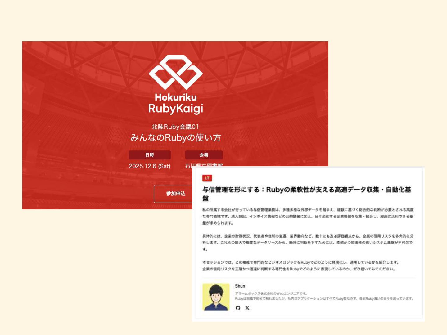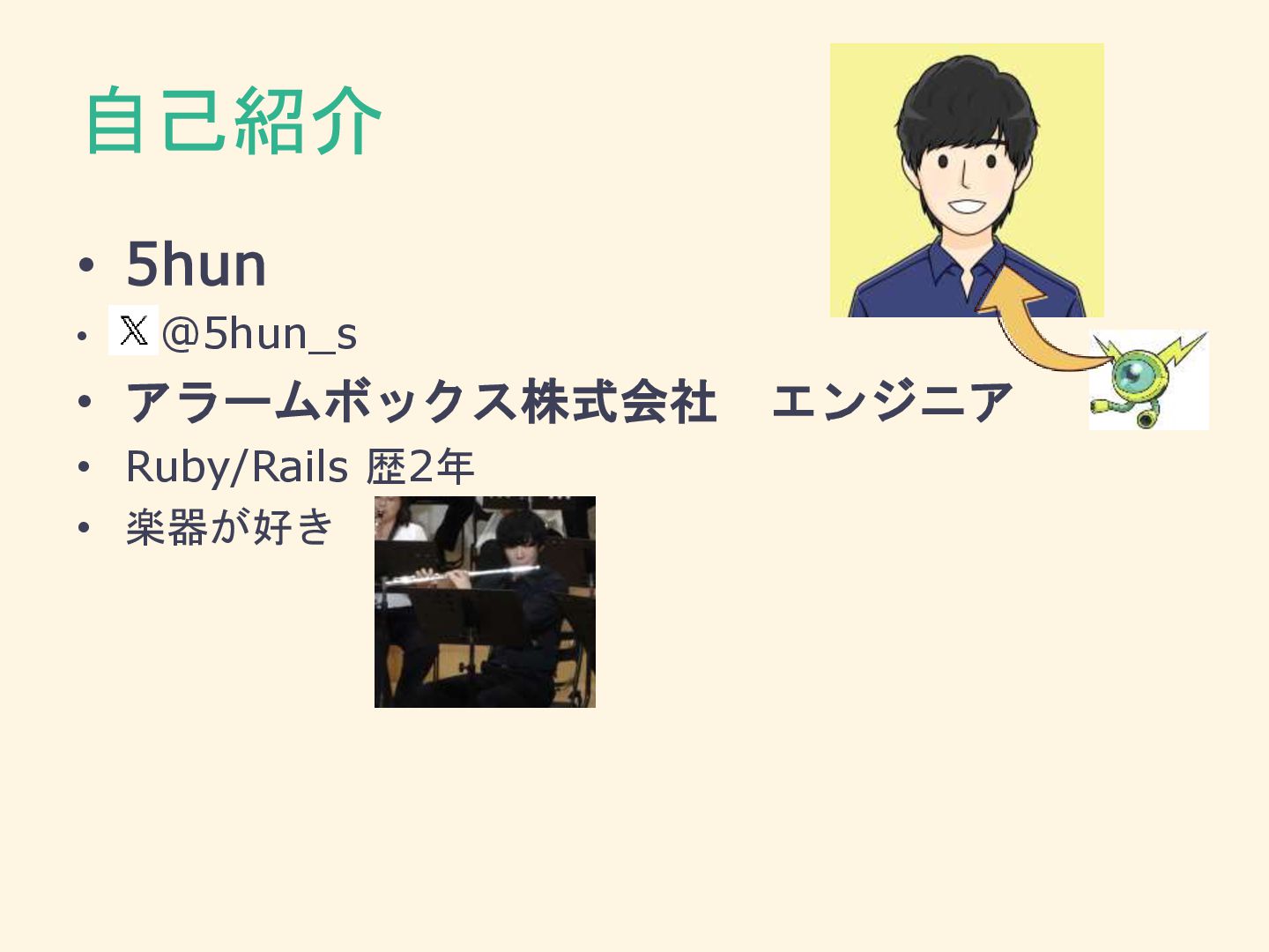 自己紹介 • 5hun • @5hun_s • アラームボックス株式会社 エンジニア • Ruby/Rails