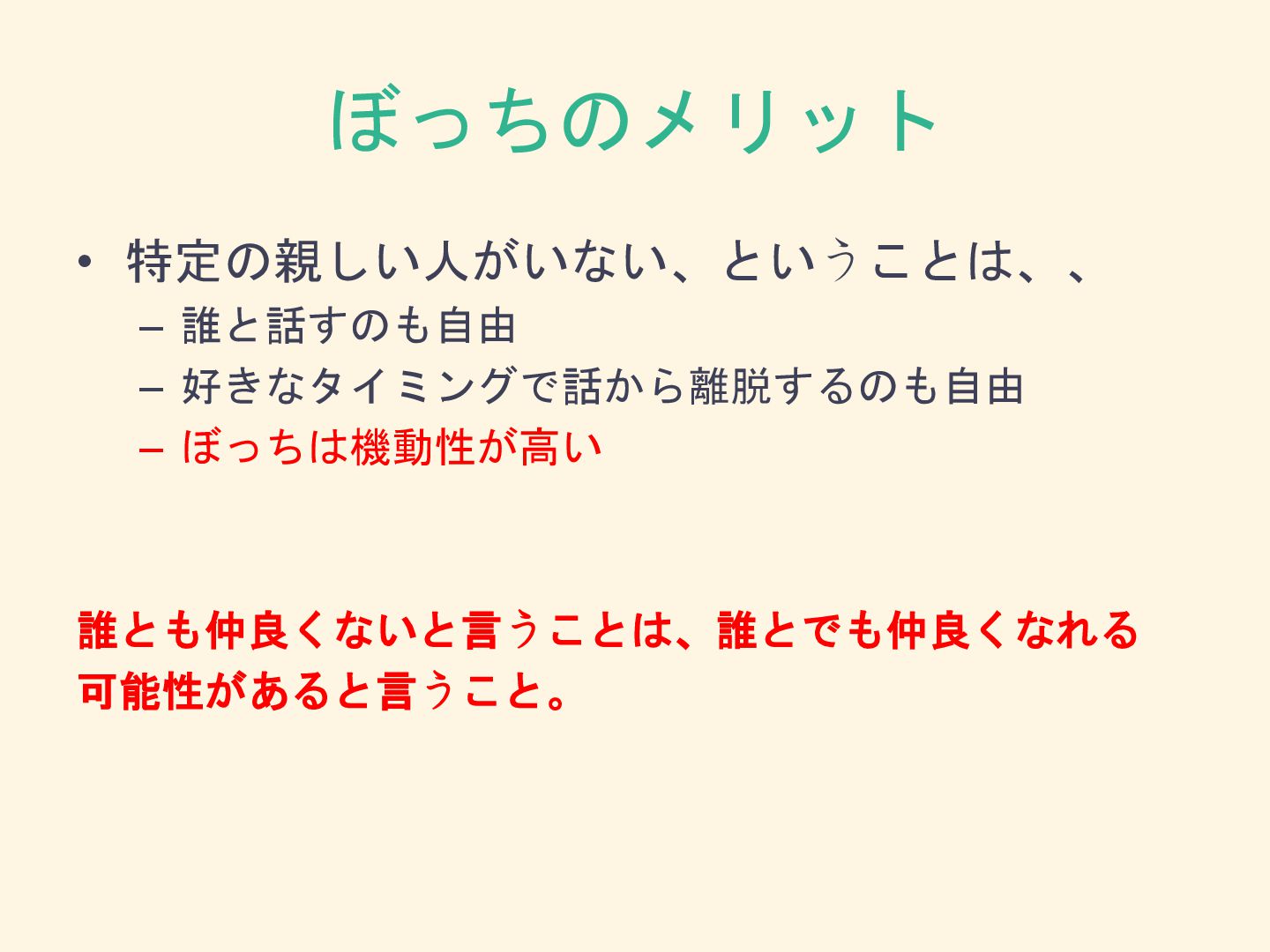 ぼっちのメリット • 特定の親しい人がいない、ということは、、 – 誰と話すのも自由 – 好きなタイミングで話から離脱するのも自由 – ぼっちは機動性が高い 誰とも仲良くないと言うことは、誰とでも仲良くなれる