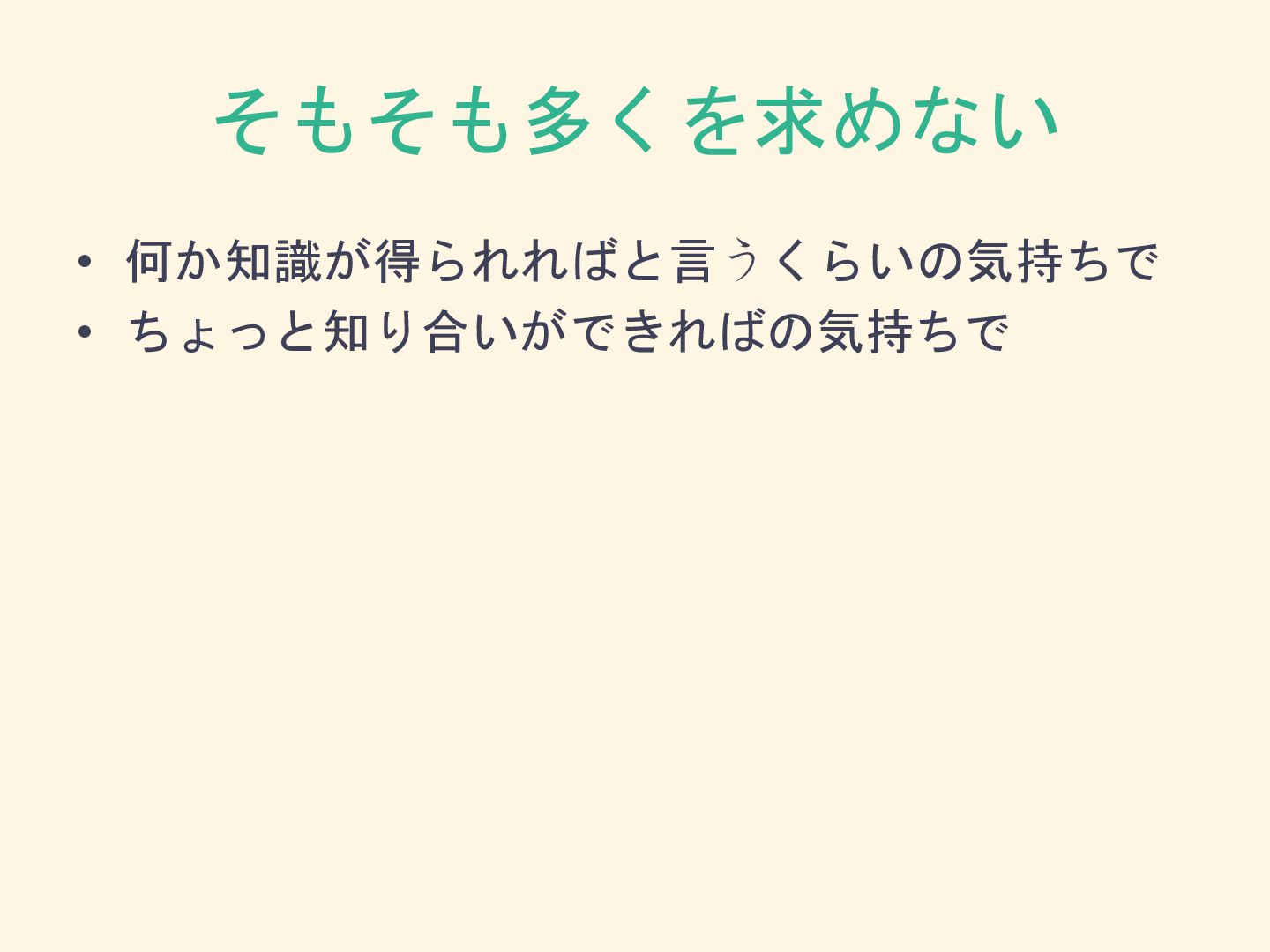 そもそも多くを求めない • 何か知識が得られればと言うくらいの気持ちで • ちょっと知り合いができればの気持ちで