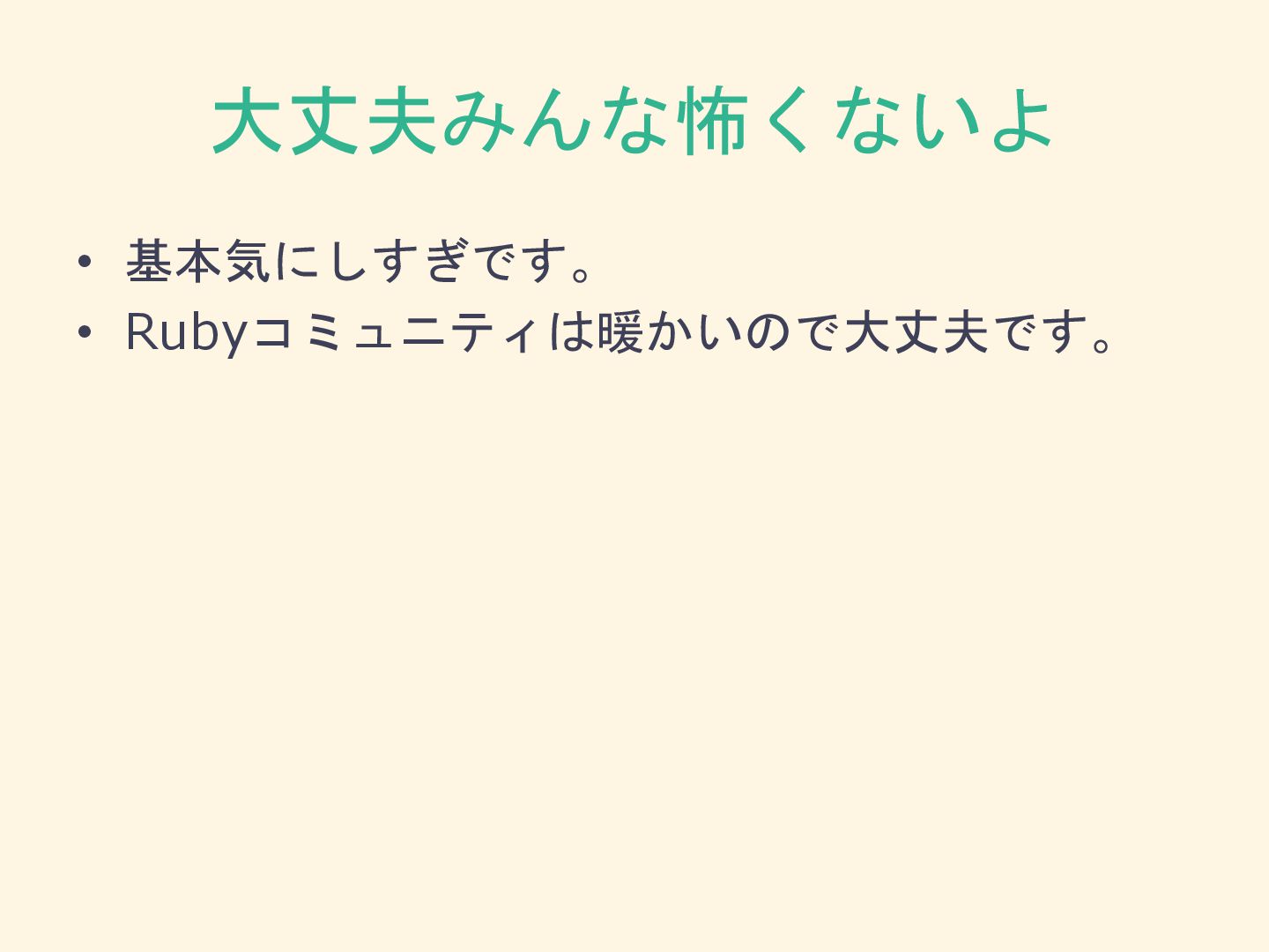 大丈夫みんな怖くないよ • 基本気にしすぎです。 • Rubyコミュニティは暖かいので大丈夫です。