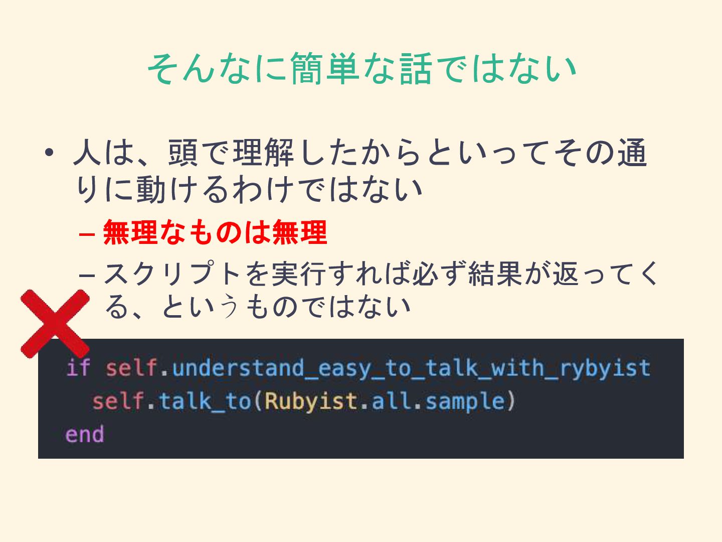 そんなに簡単な話ではない • 人は、頭で理解したからといってその通 りに動けるわけではない – 無理なものは無理 – スクリプトを実行すれば必ず結果が返ってく る、というものではない