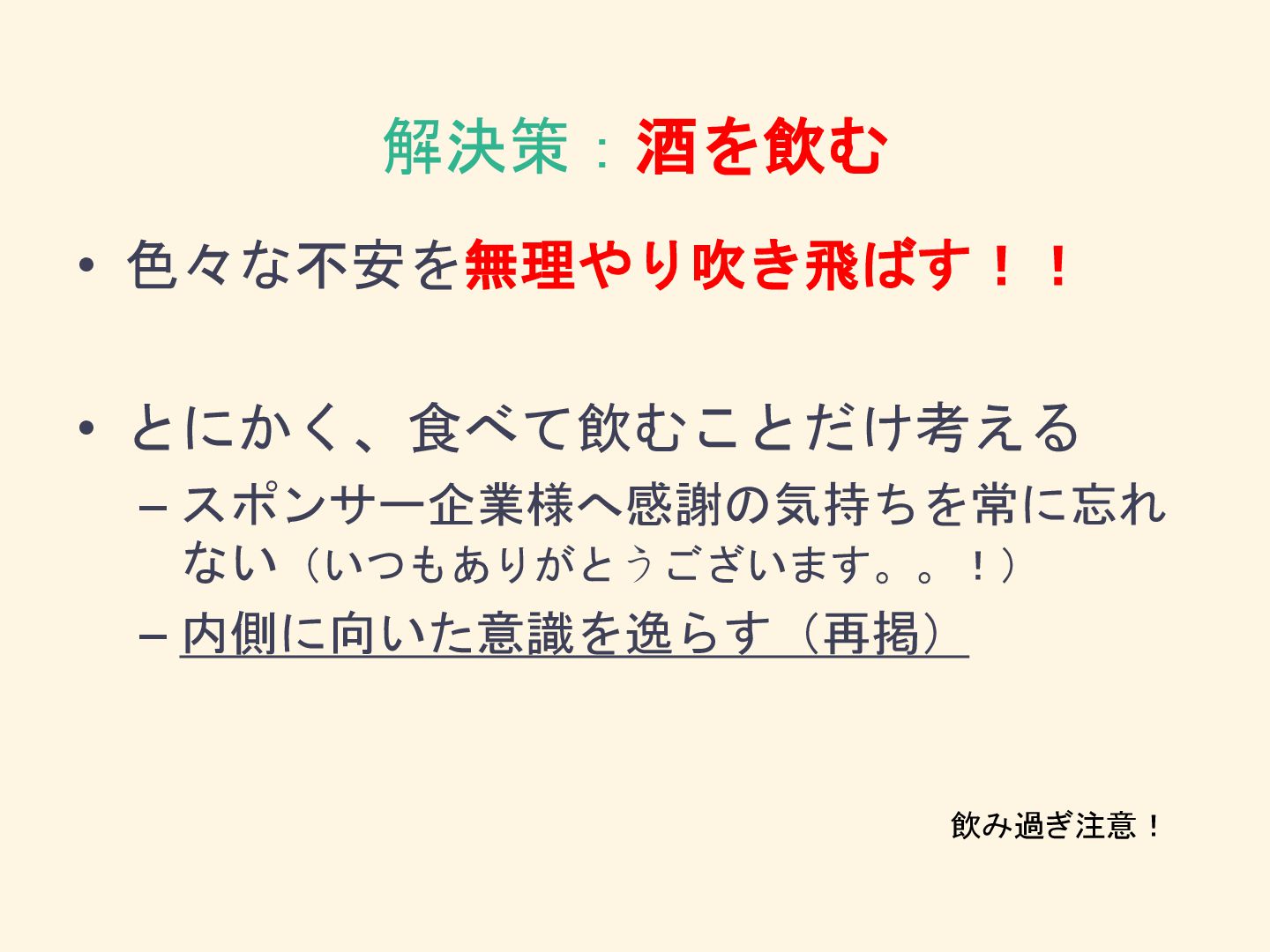 解決策:酒を飲む • 色々な不安を無理やり吹き飛ばす!! • とにかく、食べて飲むことだけ考える – スポンサー企業様へ感謝の気持ちを常に忘れ ない(いつもありがとうございます。。!) – 内側に向いた意識を逸らす(再掲)