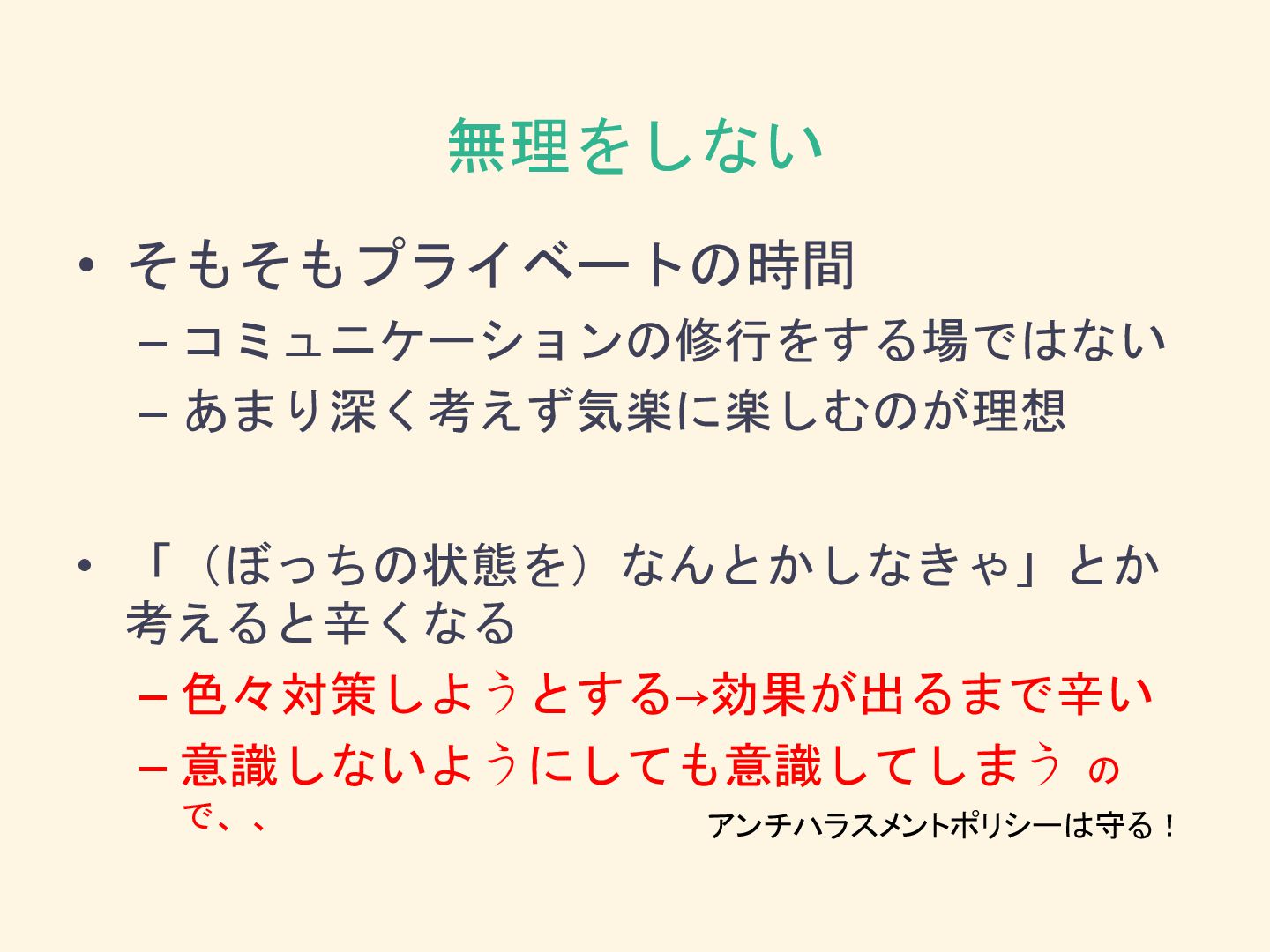 無理をしない • そもそもプライベートの時間 – コミュニケーションの修行をする場ではない – あまり深く考えず気楽に楽しむのが理想 • 「(ぼっちの状態を)なんとかしなきゃ」とか 考えると辛くなる
