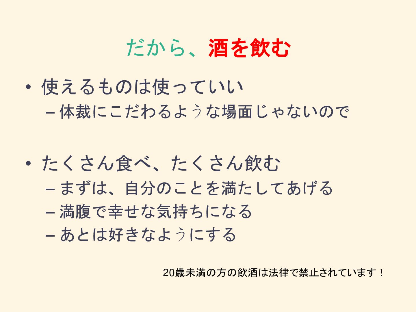 だから、酒を飲む • 使えるものは使っていい – 体裁にこだわるような場面じゃないので • たくさん食べ、たくさん飲む – まずは、自分のことを満たしてあげる –