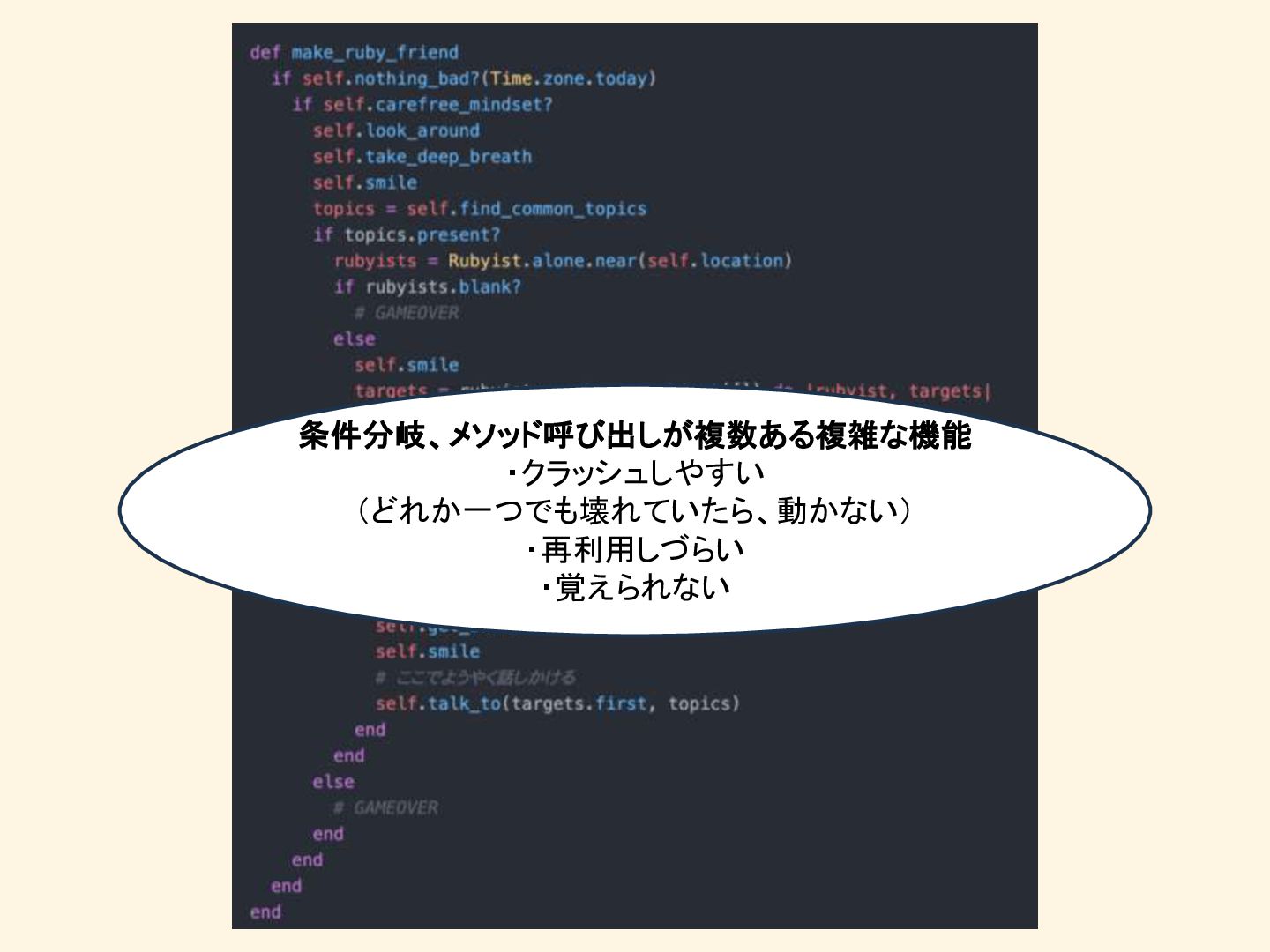 条件分岐、メソッド呼び出しが複数ある複雑な機能 ・クラッシュしやすい (どれか一つでも壊れていたら、動かない) ・再利用しづらい ・覚えられない