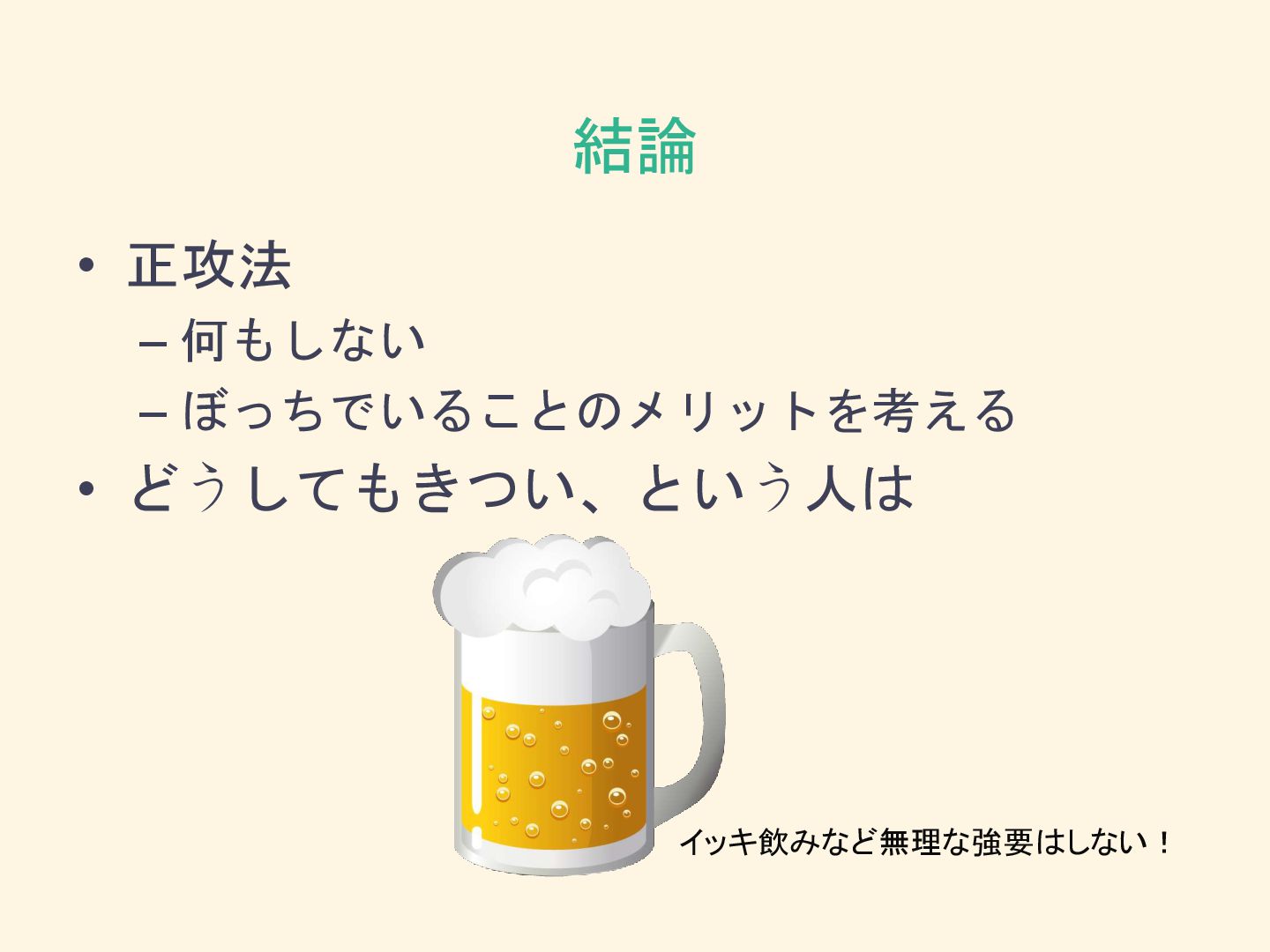 結論 • 正攻法 – 何もしない – ぼっちでいることのメリットを考える • どうしてもきつい、という人は イッキ飲みなど無理な強要はしない!