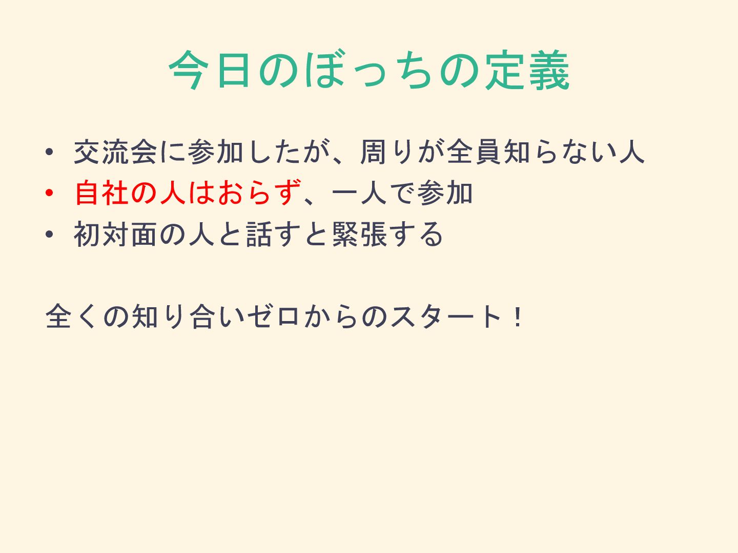 今日のぼっちの定義 • 交流会に参加したが、周りが全員知らない人 • 自社の人はおらず、一人で参加 • 初対面の人と話すと緊張する 全くの知り合いゼロからのスタート!