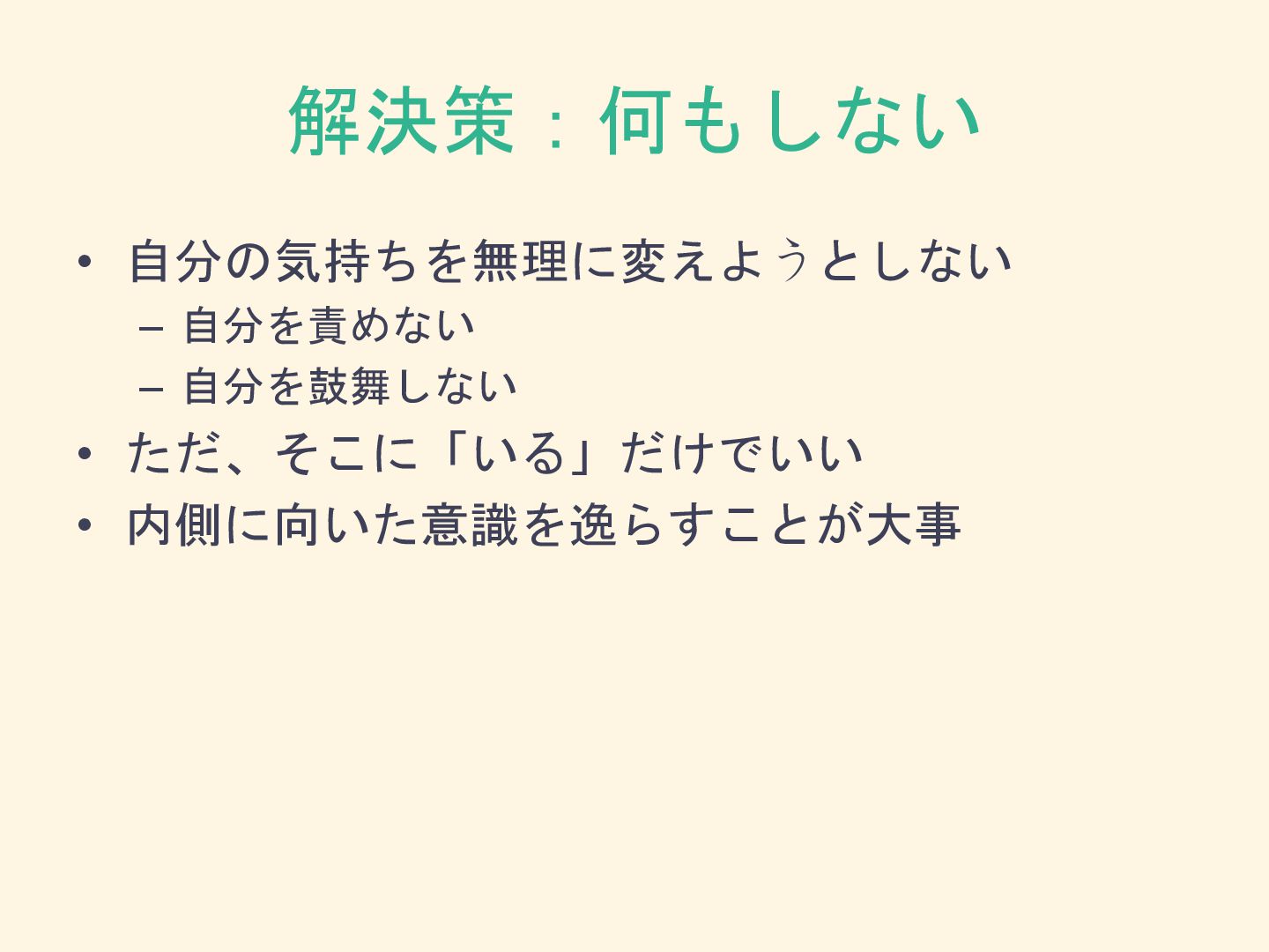 解決策:何もしない • 自分の気持ちを無理に変えようとしない – 自分を責めない – 自分を鼓舞しない • ただ、そこに「いる」だけでいい •