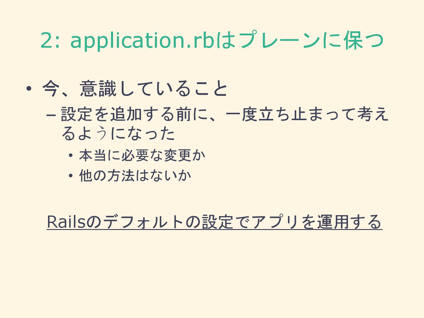 2: application.rbはプレーンに保つ • 今、意識していること – 設定を追加する前に、一度立ち止まって考え るようになった • 本当に必要な変更か •