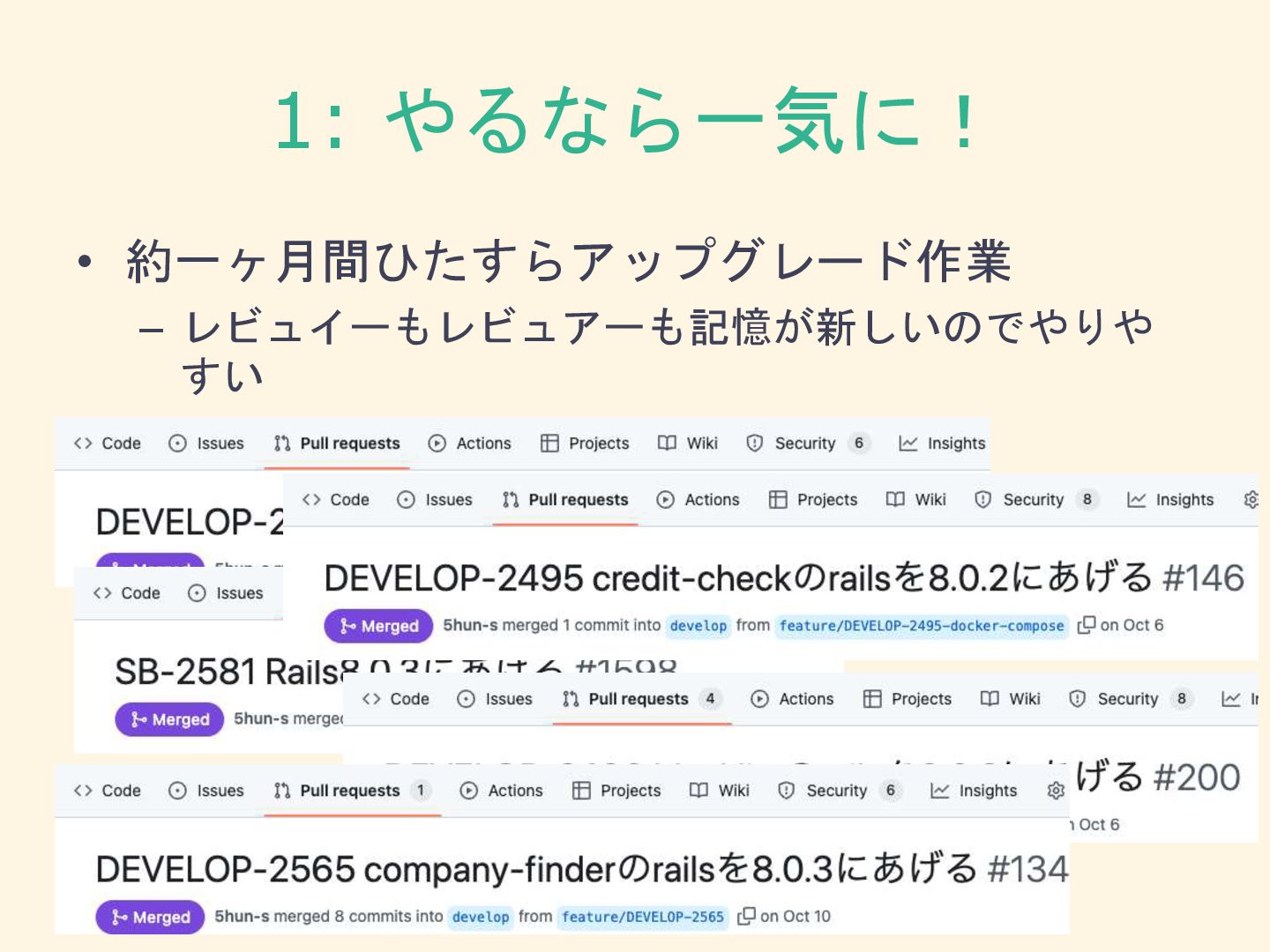 1: やるなら一気に! • 約一ヶ月間ひたすらアップグレード作業 – レビュイーもレビュアーも記憶が新しいのでやりや すい