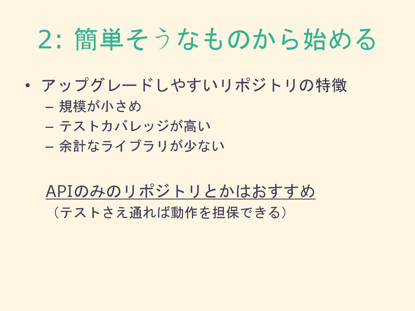 2: 簡単そうなものから始める • アップグレードしやすいリポジトリの特徴 – 規模が小さめ – テストカバレッジが高い – 余計なライブラリが少ない
