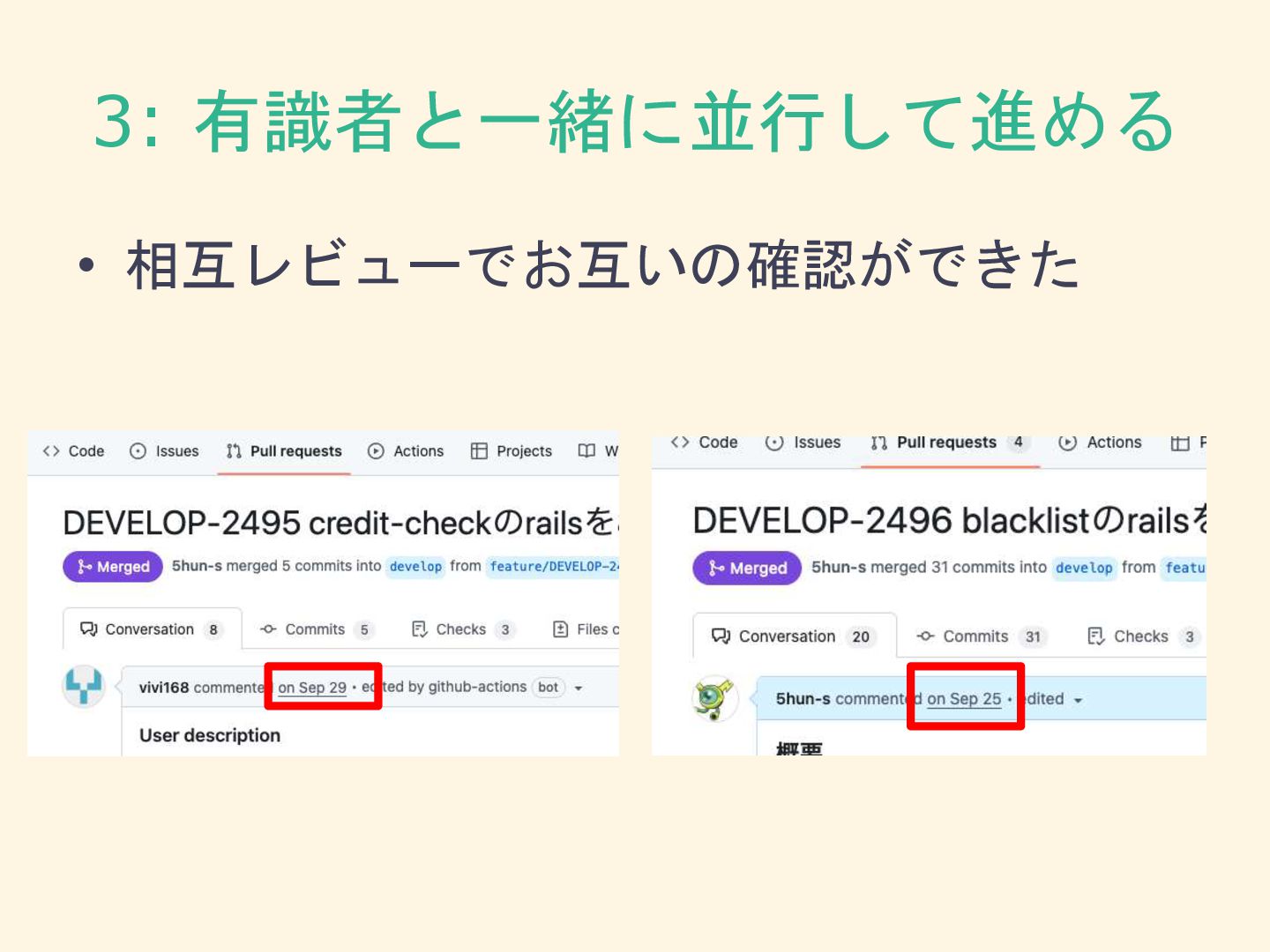 3: 有識者と一緒に並行して進める • 相互レビューでお互いの確認ができた