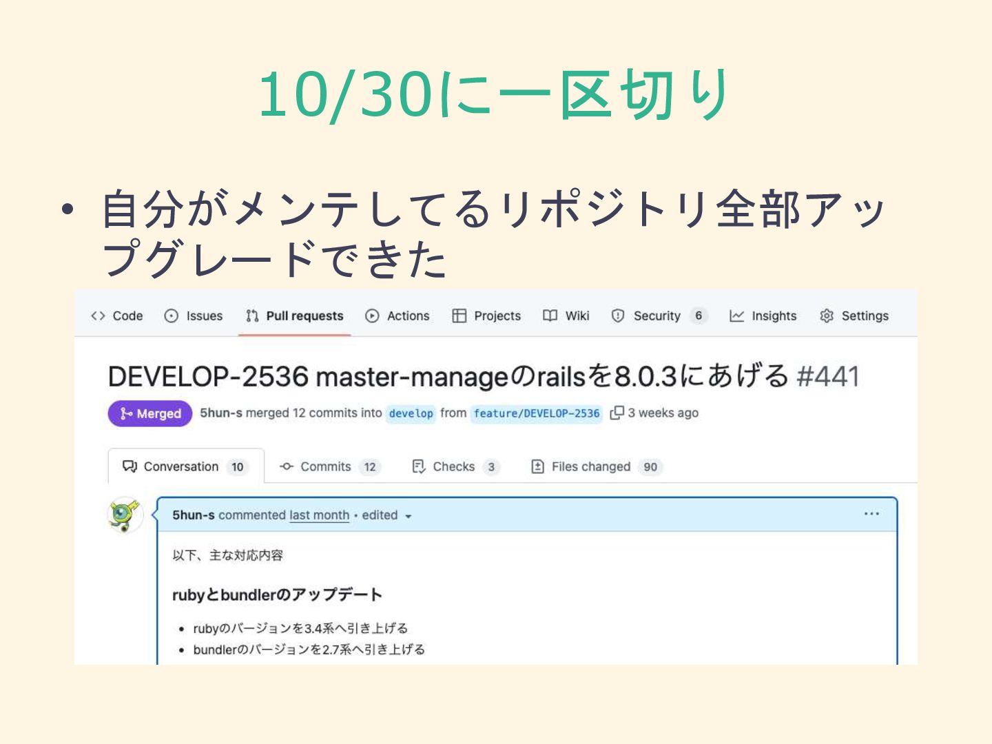 10/30に一区切り • 自分がメンテしてるリポジトリ全部アッ プグレードできた