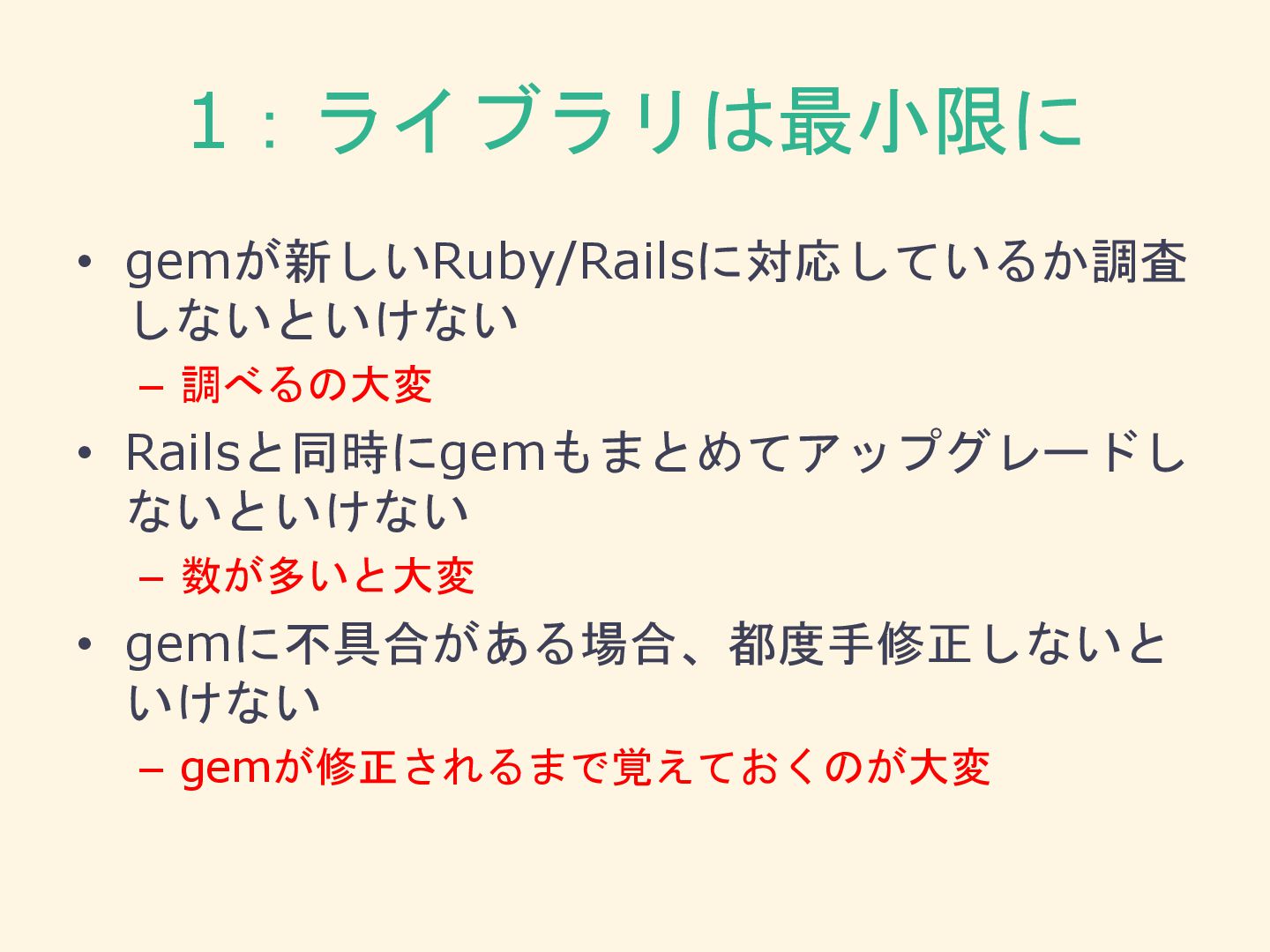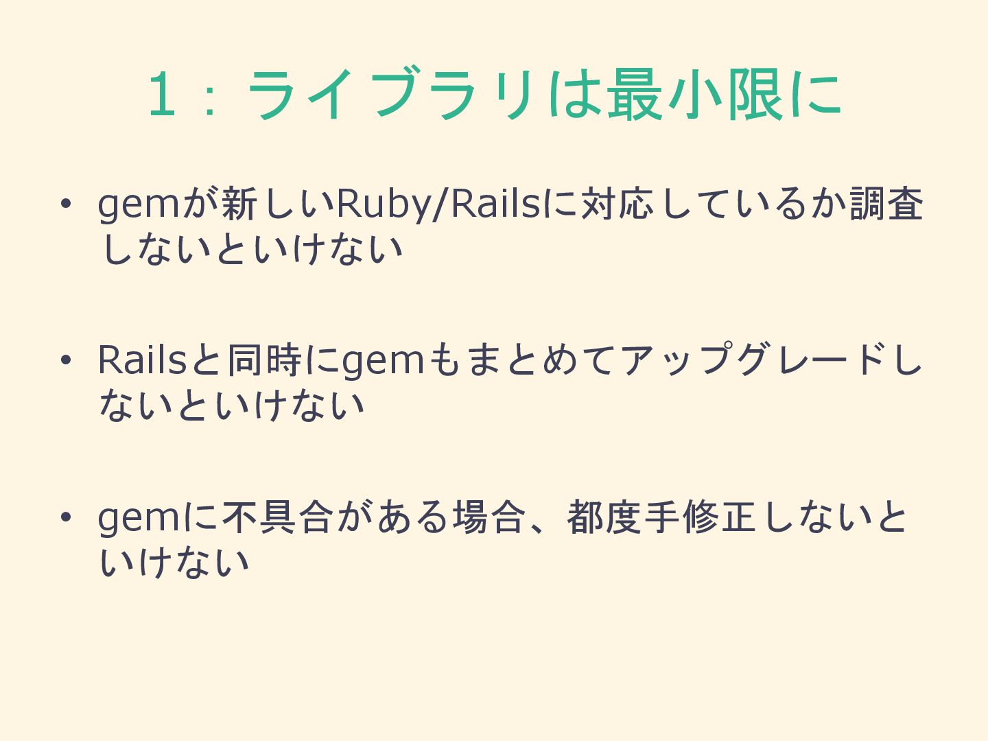 1:ライブラリは最小限に • gemが新しいRuby/Railsに対応しているか調査 しないといけない – 調べるの大変 • Railsと同時にgemもまとめてアップグレードし ないといけない –
