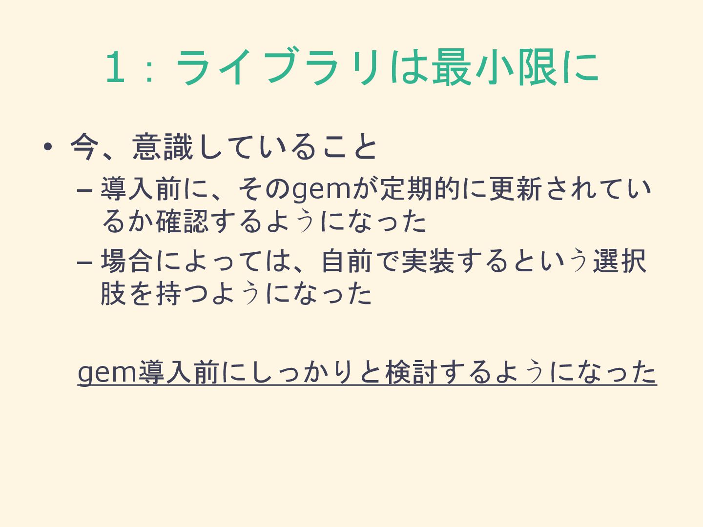 1:ライブラリは最小限に • 今、意識していること – 導入前に、そのgemが定期的に更新されてい るか確認するようになった – 場合によっては、自前で実装するという選択 肢を持つようになった gem導入前にしっかりと検討するようになった