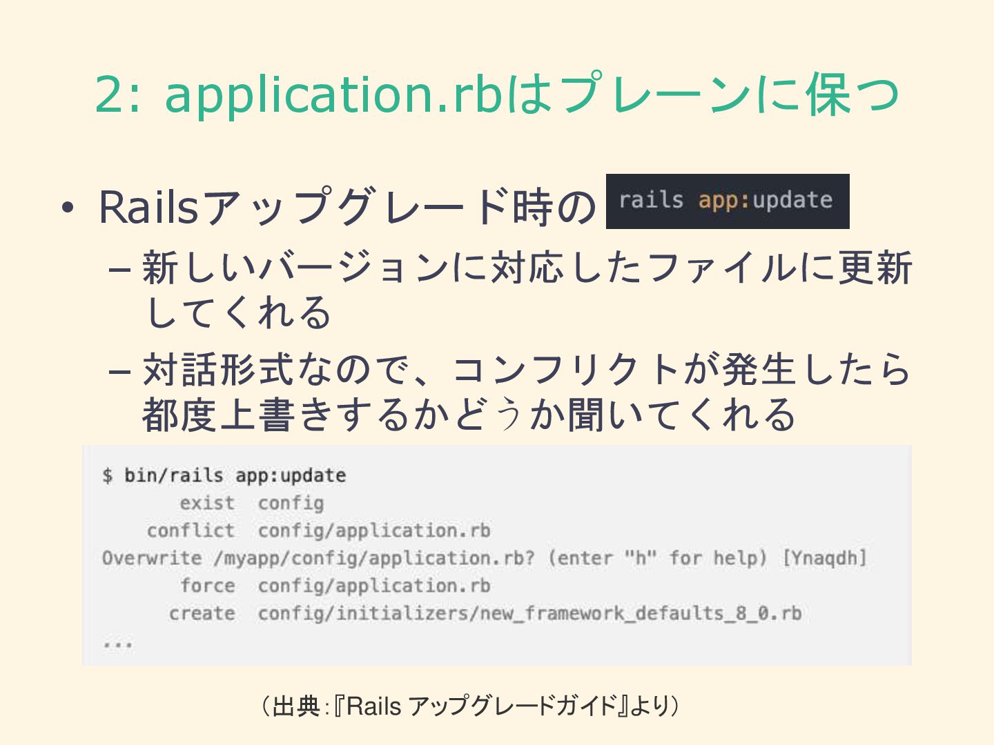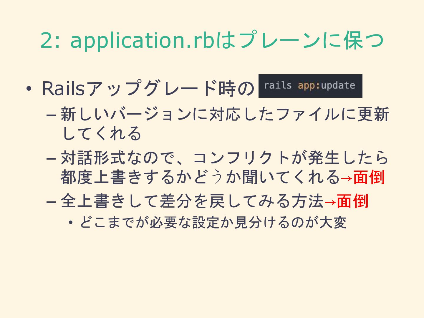 2: application.rbはプレーンに保つ • Railsアップグレード時の – 新しいバージョンに対応したファイルに更新 してくれる – 対話形式なので、コンフリクトが発生したら 都度上書きするかどうか聞いてくれる→面倒
