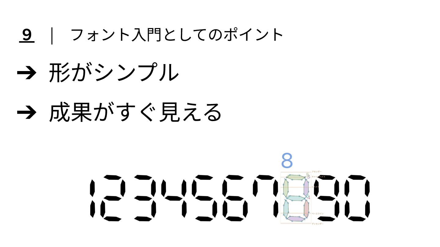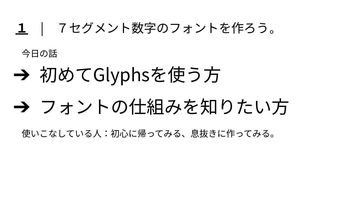 7 セグメント表示の数字を題材に、 フォント制作や文字設計に初めて触れる方向けにまとめた LT スライドです。 Glyphs での制作を前提としていますが、 考え方は Illustrator など他のデザインツールでも応用できます。 文字づくりの入口として参考になれば嬉しいです。