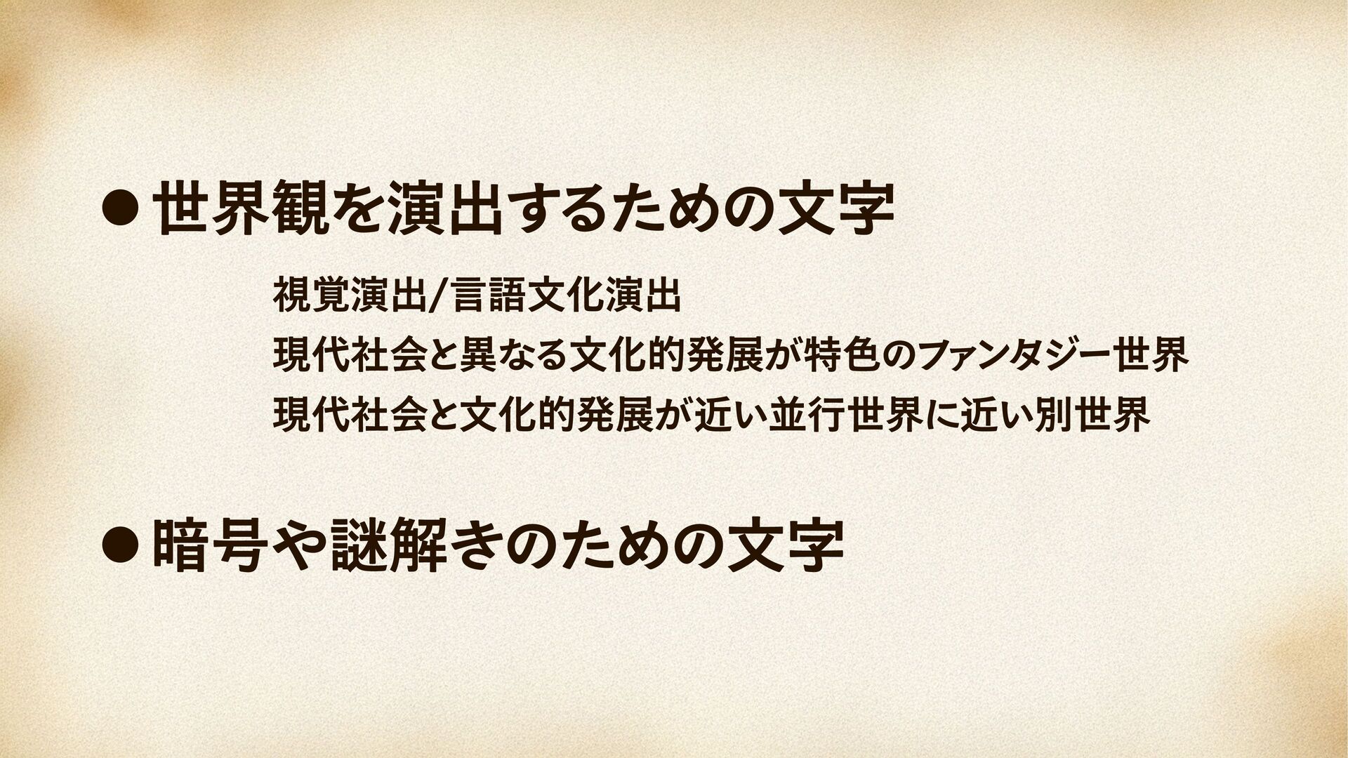実在の作品に登場する架空文字・架空言語をいくつか取り上げ、 それらがどのような前提や発想で作られているのかを、 見た目や使われ方の側面から眺めていく内容です。 世界観の演出、言語文化の表現、暗号や謎解きといった用途に注目しながら、 実際の例を見比べて考えたことをまとめています。