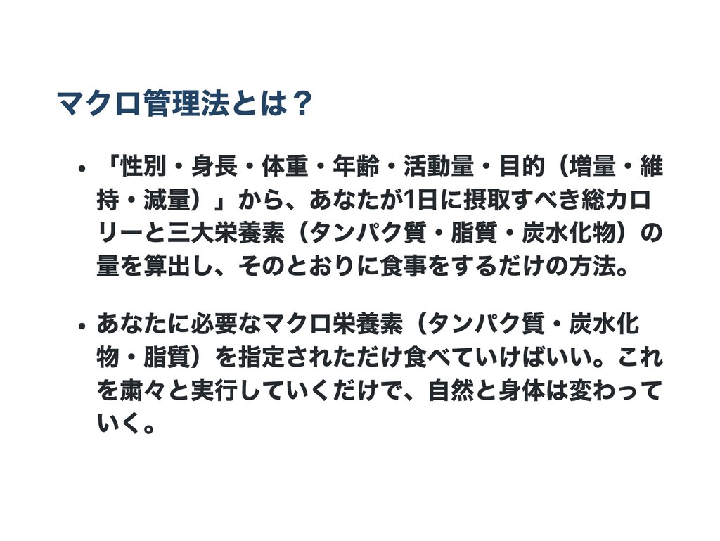 マクロ管理法とは? 「性別・身長・体重・年齢・活動量・目的(増量・維 持・減量)」から、あなたが1日に摂取すべき総カロ リーと三大栄養素(タンパク質・脂質・炭水化物)の 量を算出し、そのとおりに食事をするだけの方法。 あなたに必要なマクロ栄養素(タンパク質・炭水化 物・脂質)を指定されただけ食べていけばいい。これ を粛々と実行していくだけで、自然と身体は変わって いく。
