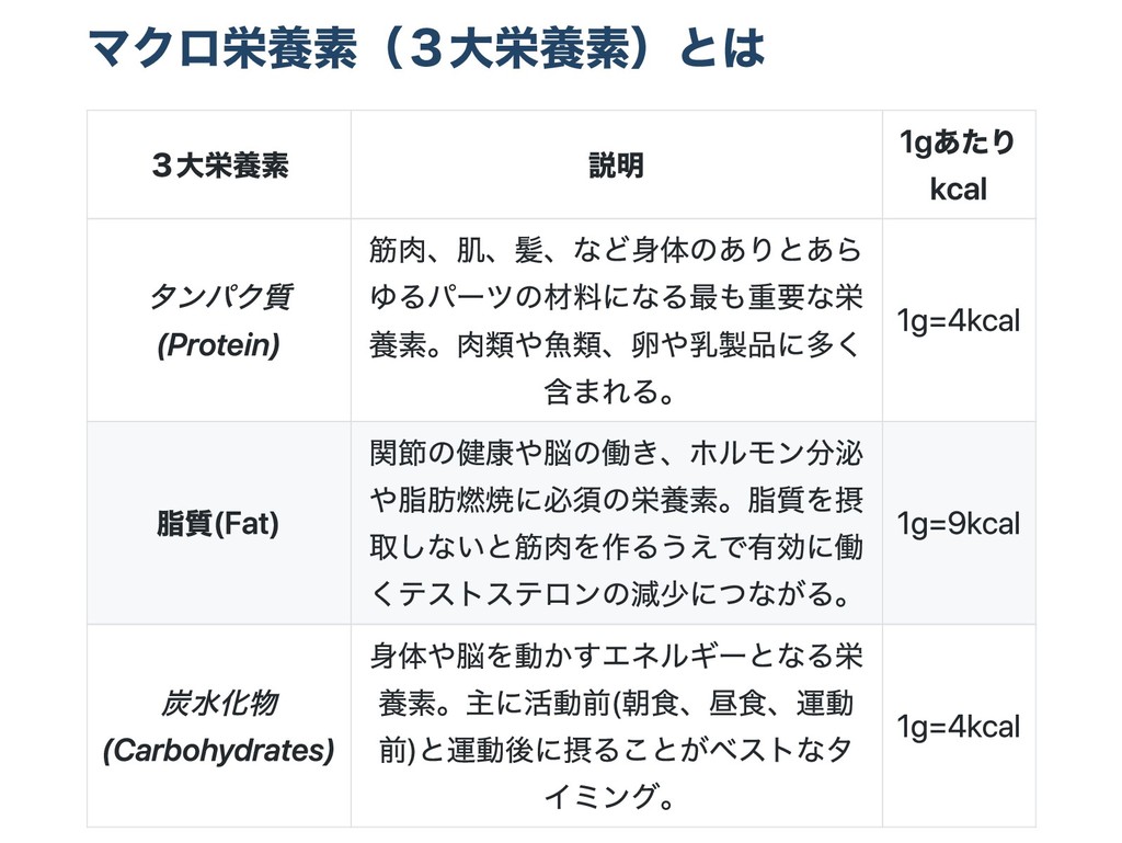 マクロ栄養素(3大栄養素)とは 3大栄養素 説明 1gあたり kcal タンパク質 (Protein) 筋肉、肌、髪、など身体のありとあら ゆるパーツの材料になる最も重要な栄 養素。肉類や魚類、卵や乳製品に多く