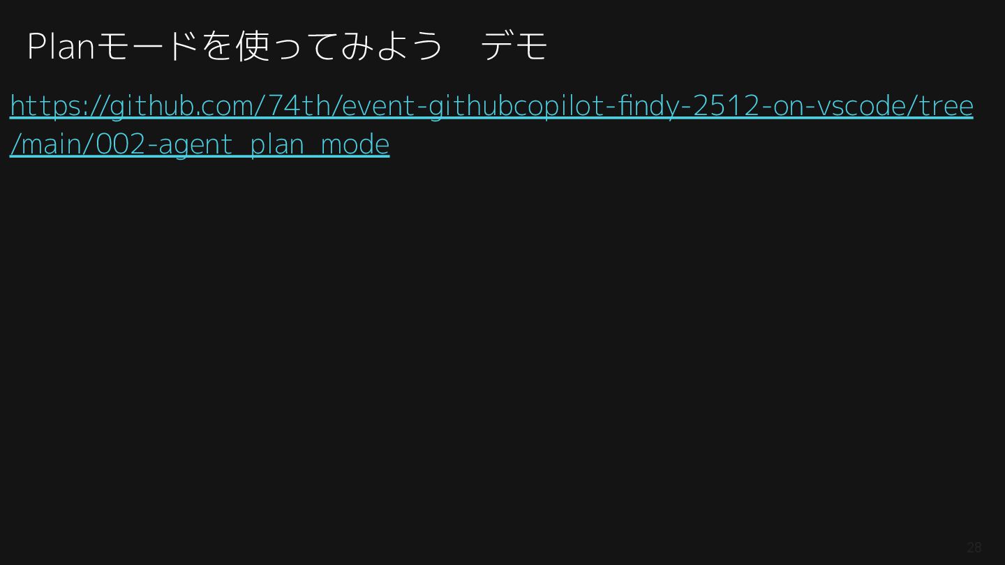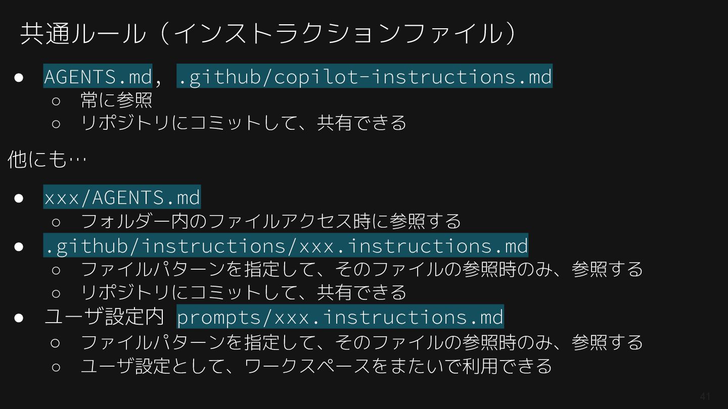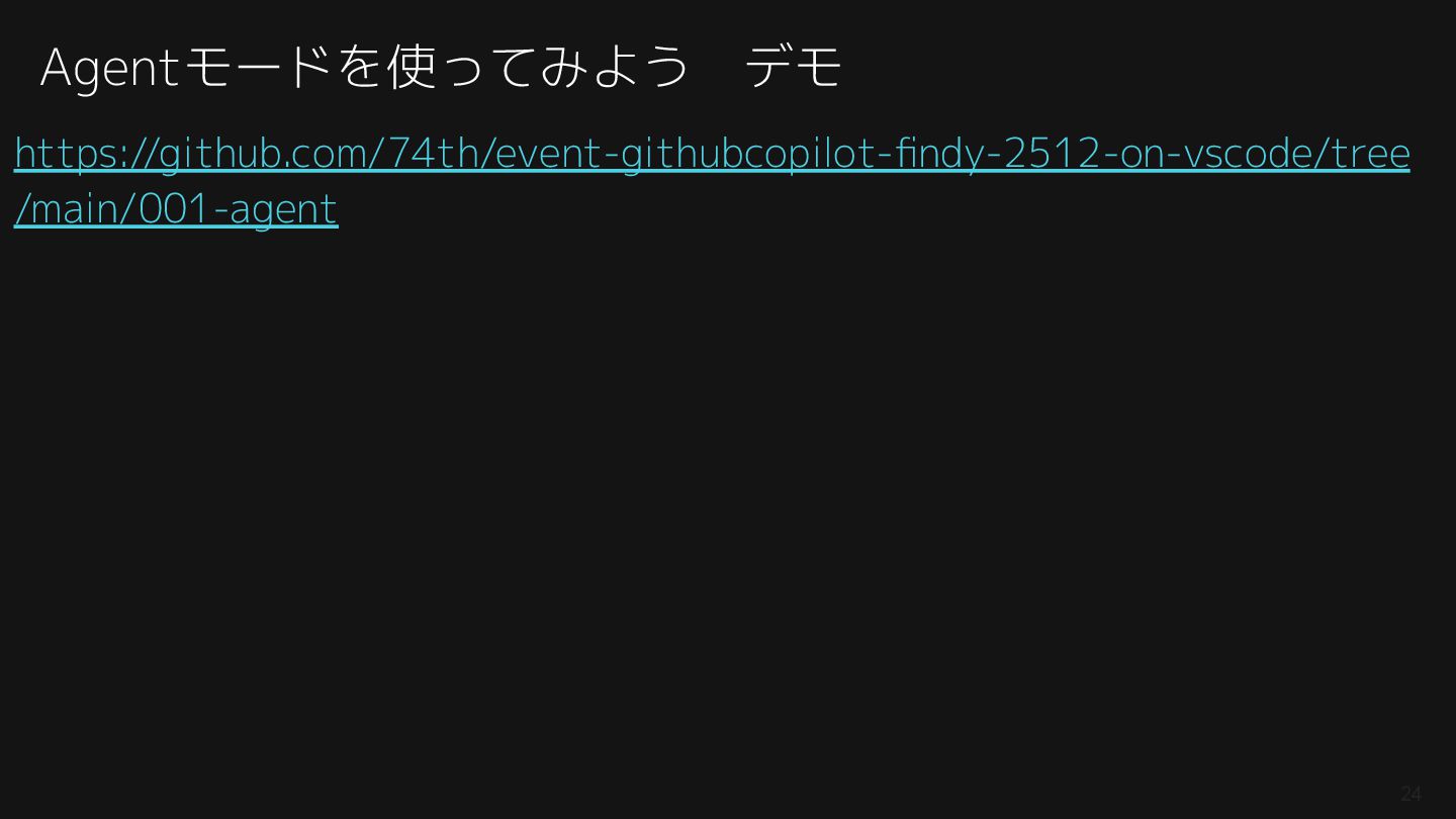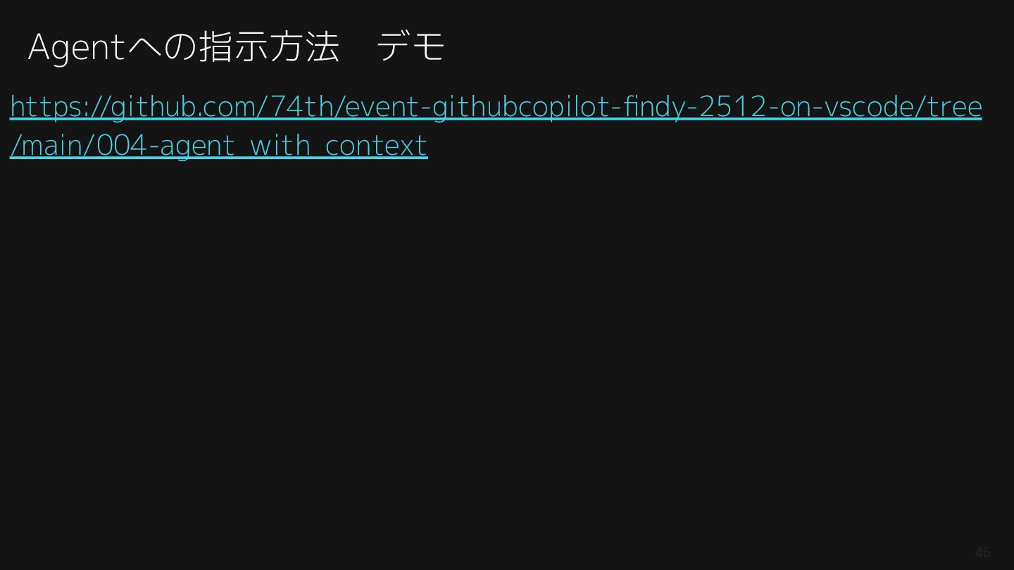 紹介したAGENTS.md: https://github.com/74th/event-githubcopilot-findy-2512-on-vscode/blob/main/004-agent_with_context/AGENTS.md