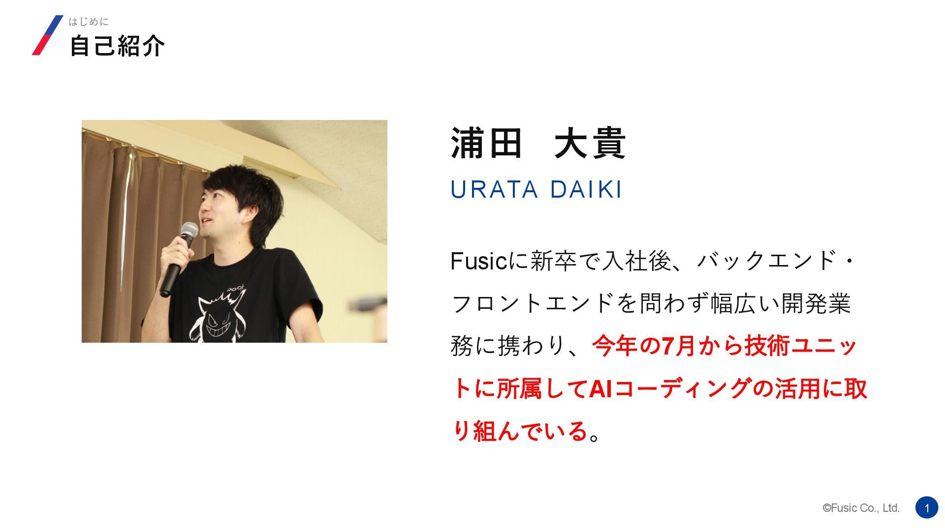 ©Fusic Co., Ltd. 0 社内でのAIコーディング実践と効果 2025.10.21 株式会社Fusic 浦田 大貴 Fusic