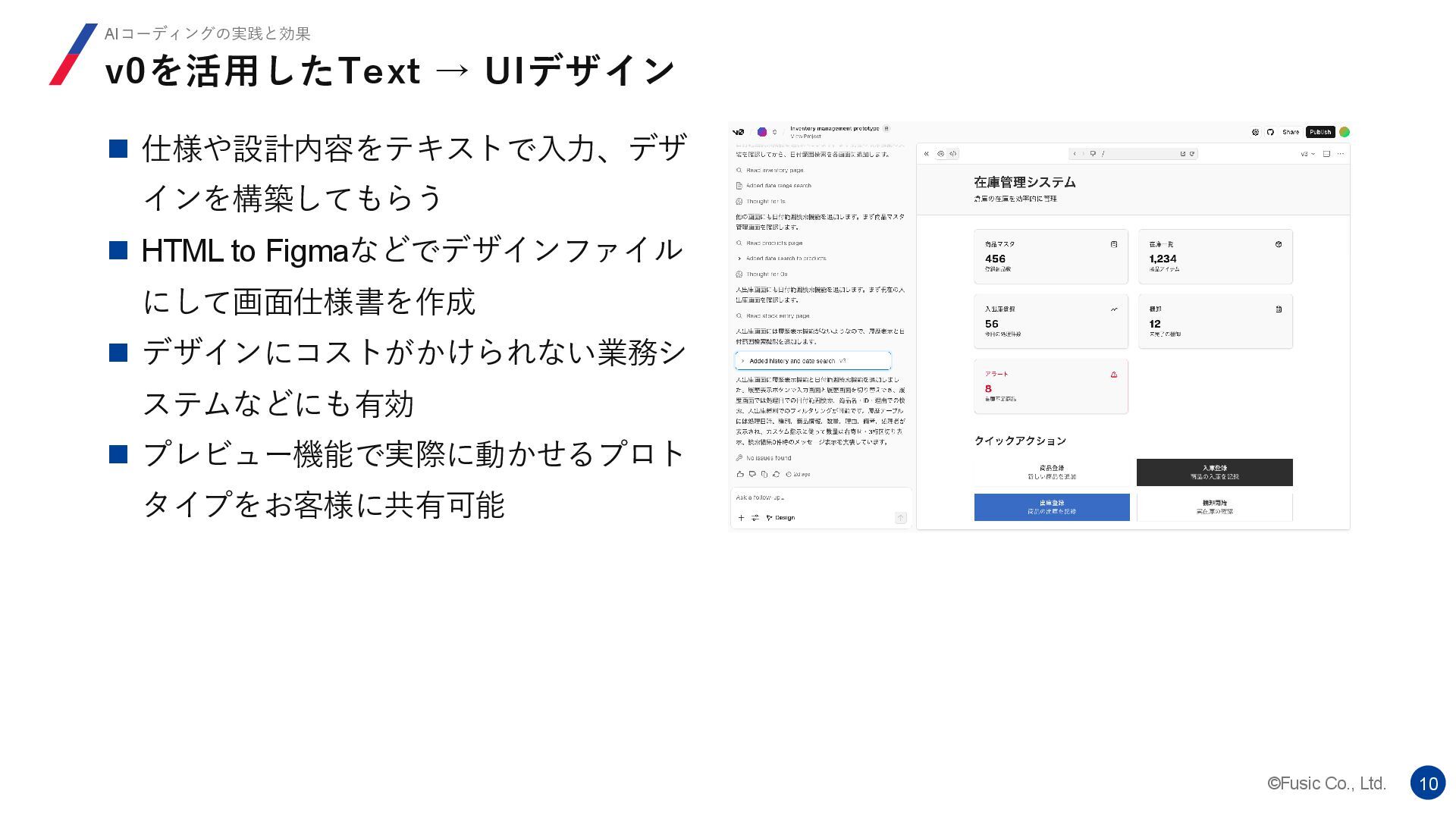 ©Fusic Co., Ltd. 10 v0を活用したText → UIデザイン AIコーディングの実践と効果 ◼ 仕様や設計内容をテキストで入力、デザ