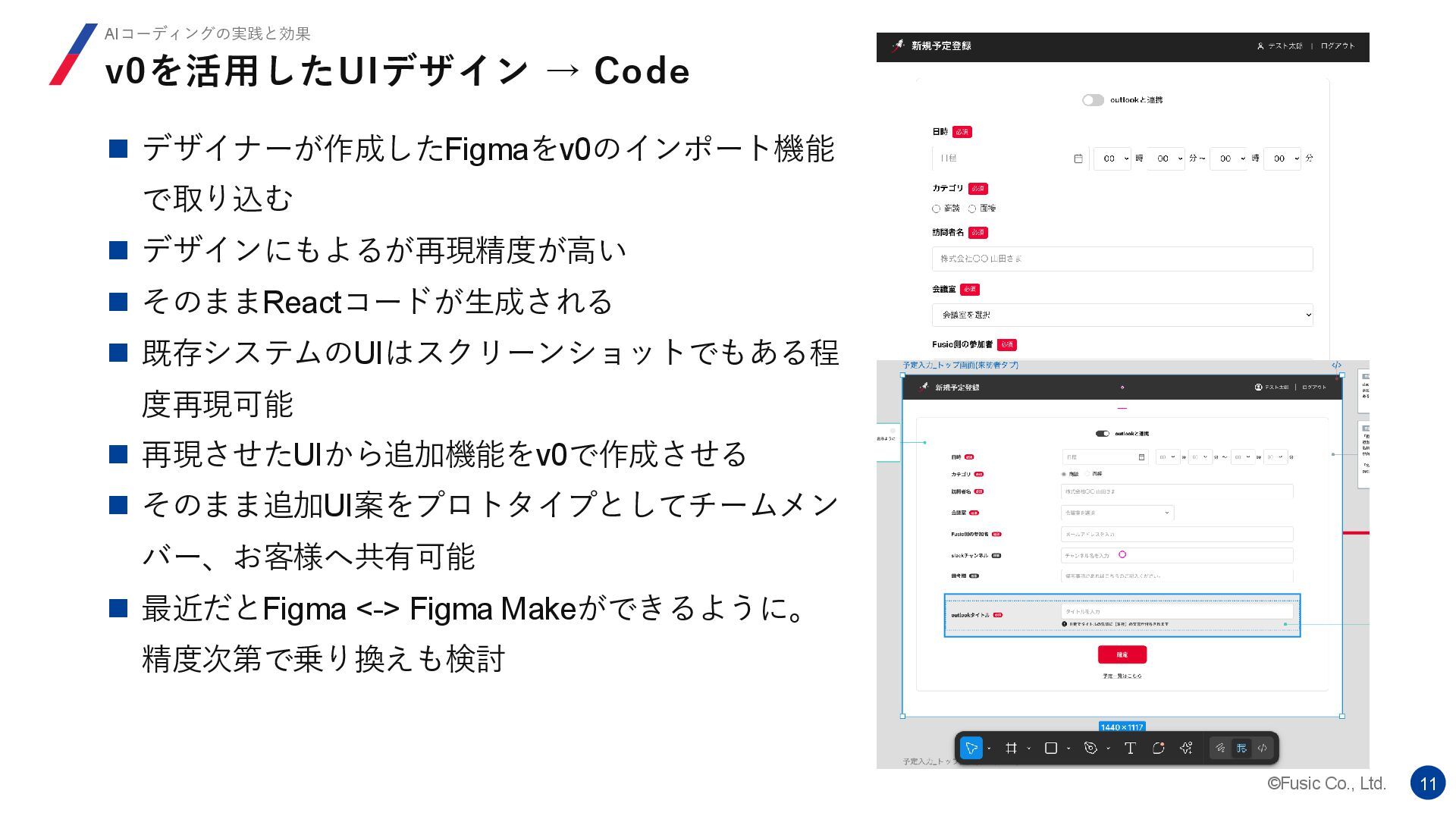 ©Fusic Co., Ltd. 11 v0を活用したUIデザイン → Code AIコーディングの実践と効果 ◼ デザイナーが作成したFigmaをv0のインポート機能