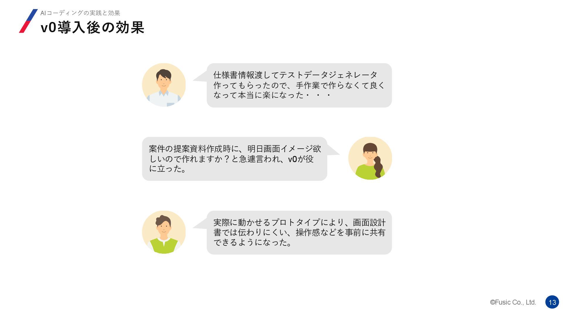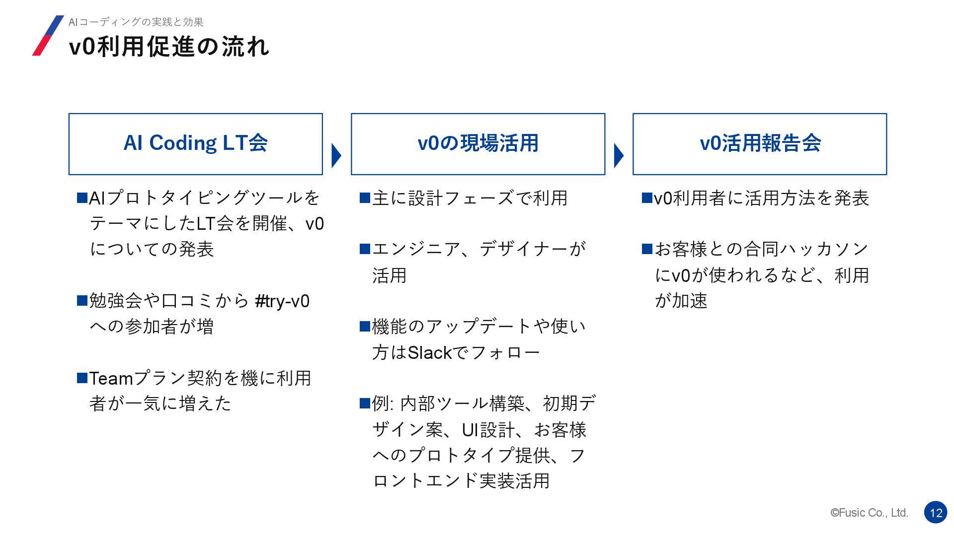 ©Fusic Co., Ltd. 12 v0利用促進の流れ AIコーディングの実践と効果 AI Coding LT会 ◼AIプロトタイピングツールを