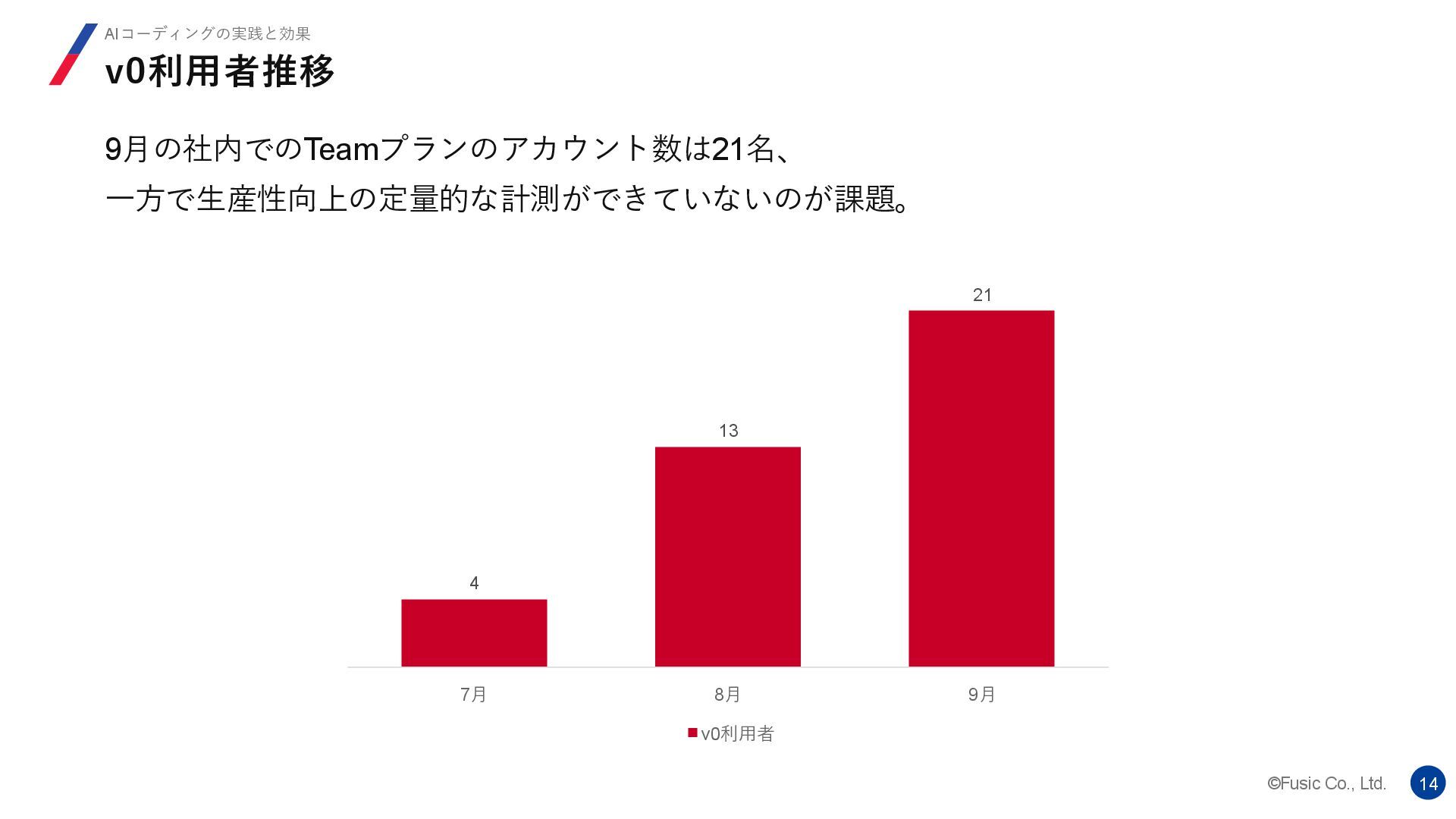 ©Fusic Co., Ltd. 14 v0利用者推移 AIコーディングの実践と効果 4 13 21 7月