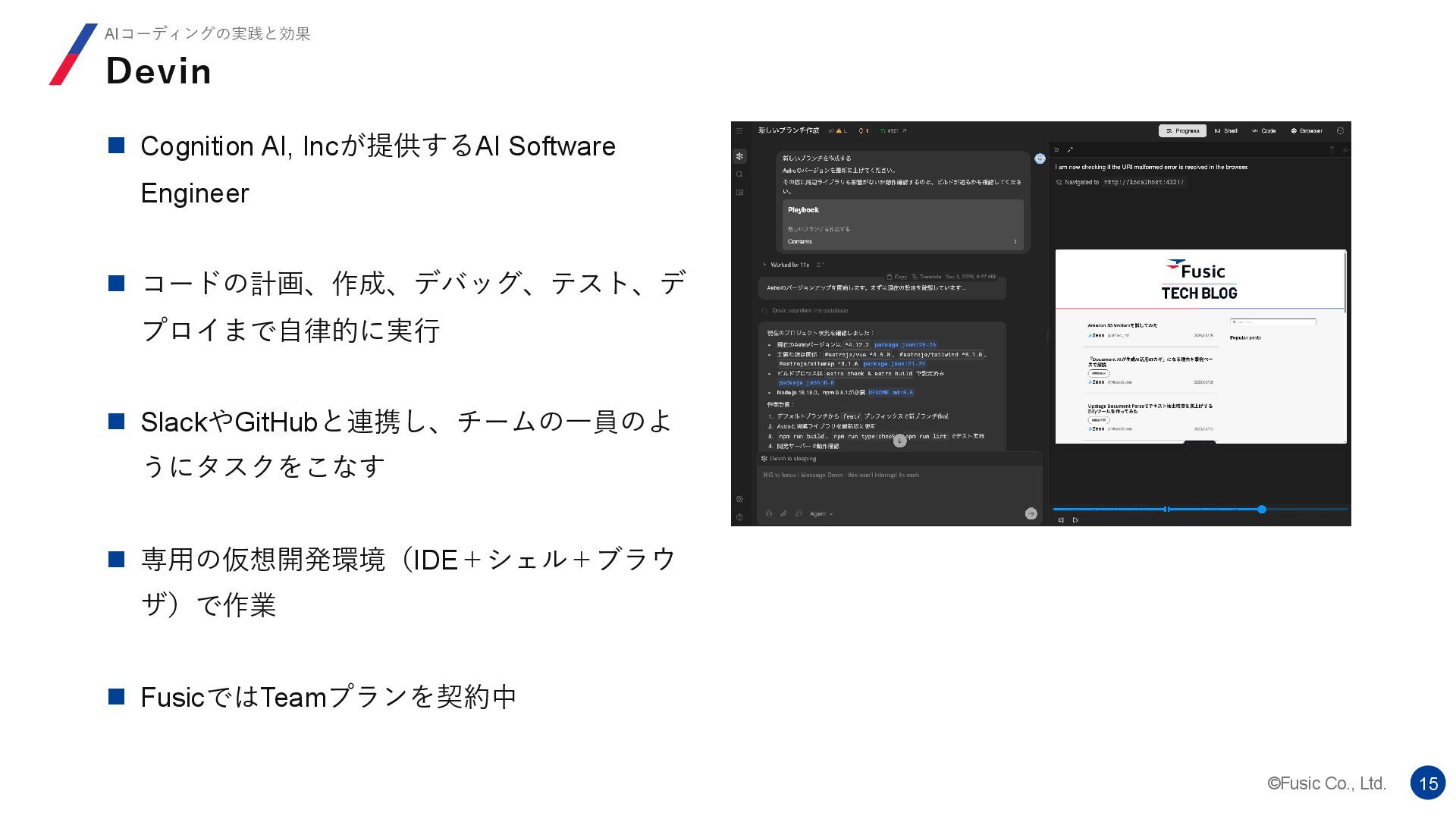 ©Fusic Co., Ltd. 15 Devin AIコーディングの実践と効果 ◼ Cognition AI, Incが提供するAI