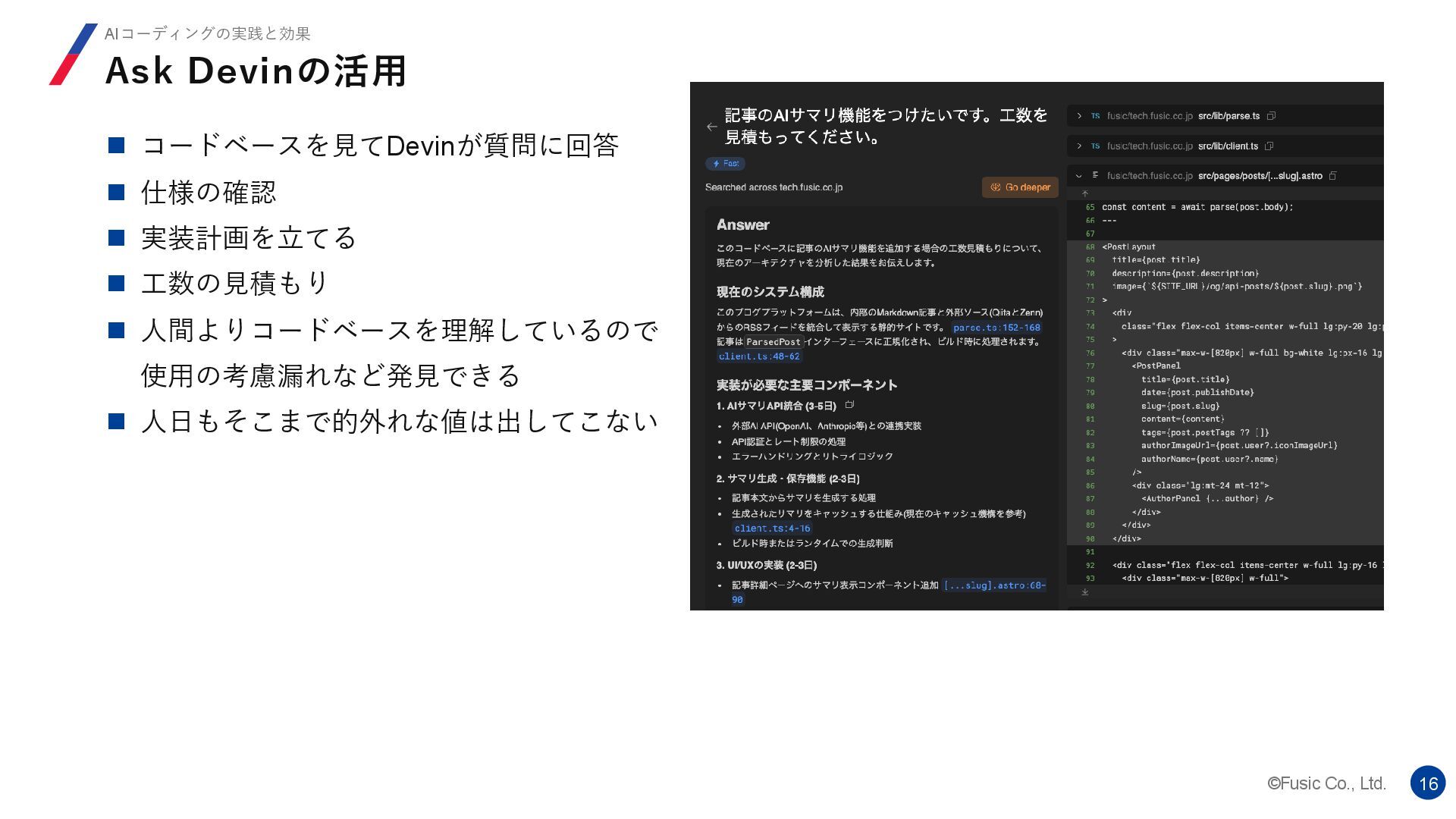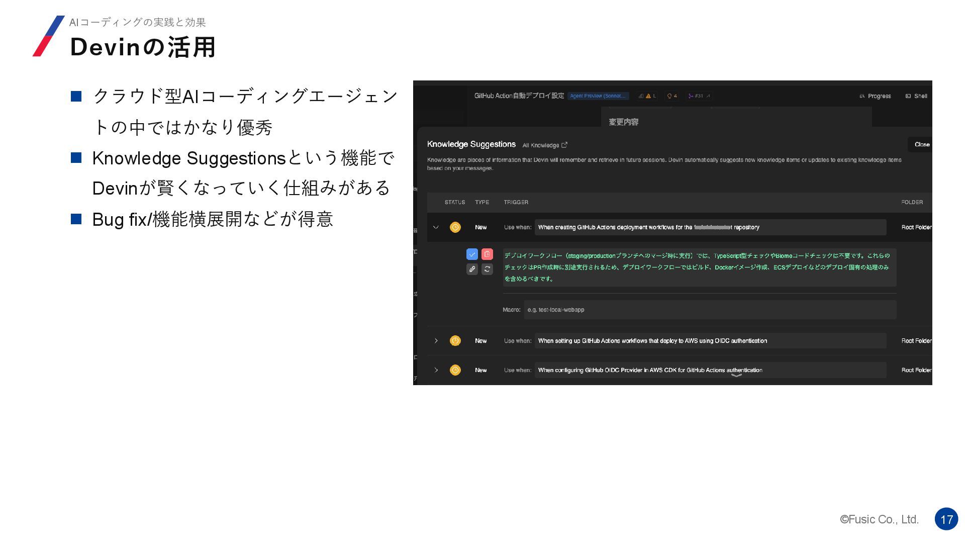 ©Fusic Co., Ltd. 16 Ask Devinの活用 AIコーディングの実践と効果 ◼ コードベースを見てDevinが質問に回答 ◼