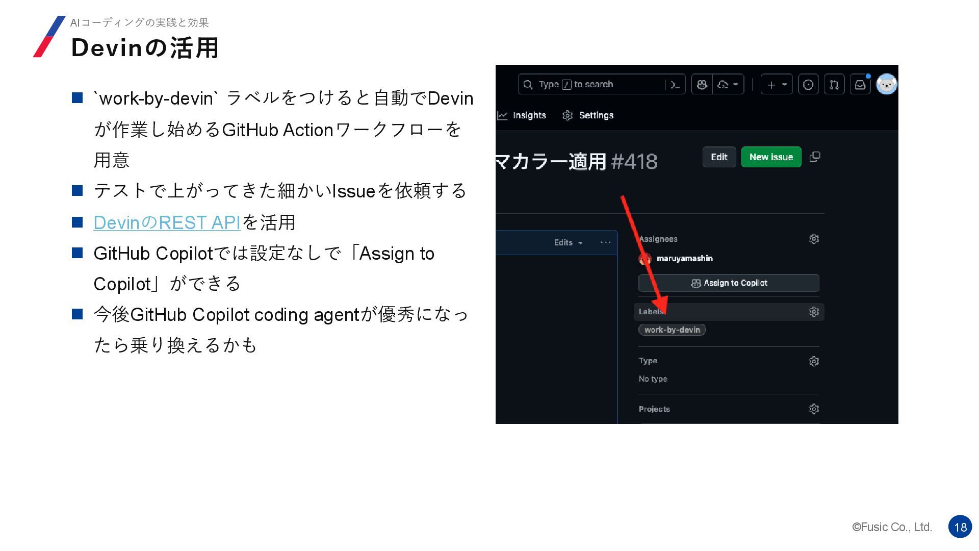 ©Fusic Co., Ltd. 18 Devinの活用 AIコーディングの実践と効果 ◼ `work-by-devin` ラベルをつけると自動でDevin が作業し始めるGitHub