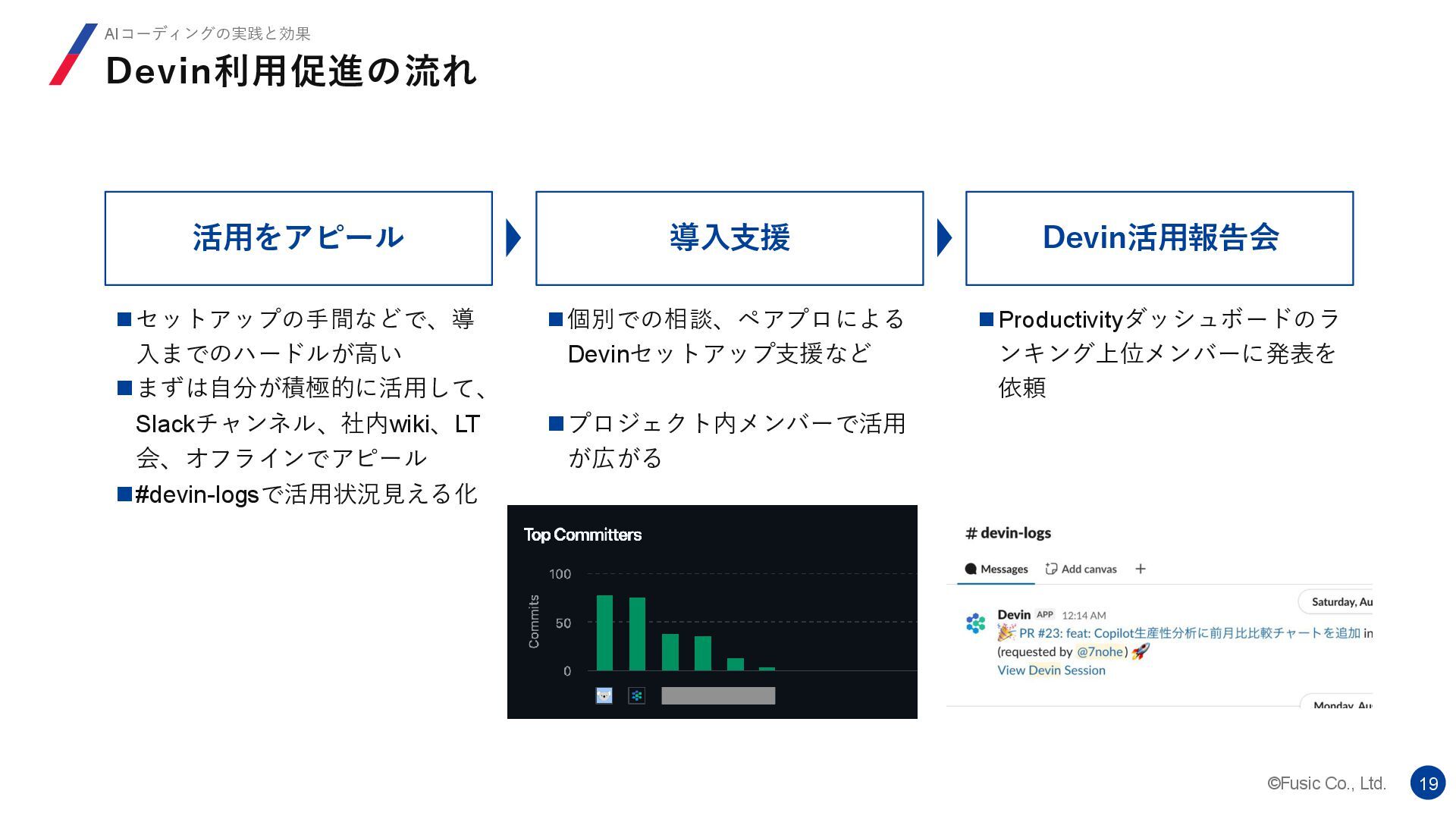 ©Fusic Co., Ltd. 19 Devin利用促進の流れ AIコーディングの実践と効果 活用をアピール ◼セットアップの手間などで、導 入までのハードルが高い ◼まずは自分が積極的に活用して、