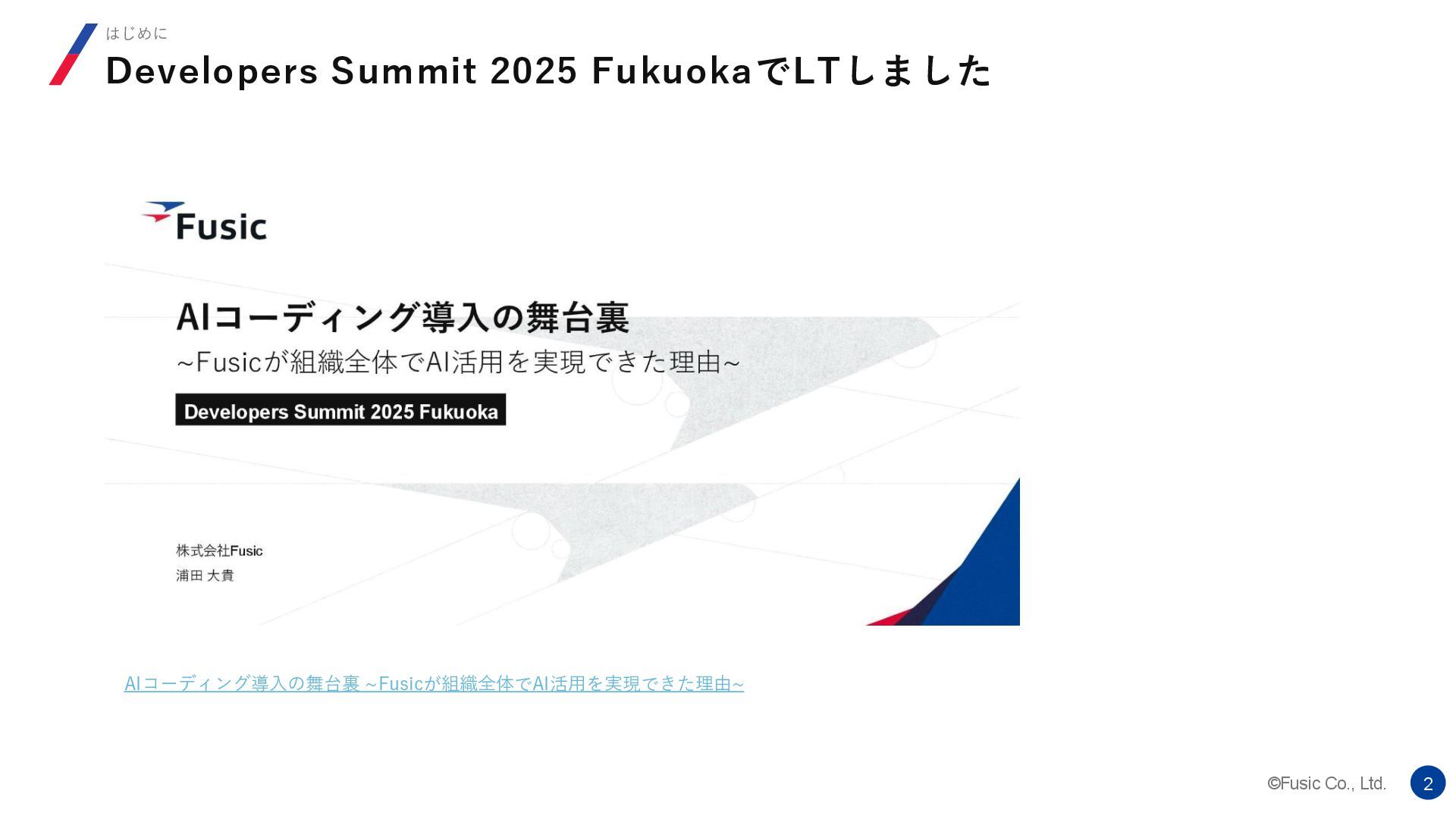 ©Fusic Co., Ltd. 2 Developers Summit 2025 FukuokaでLTしました はじめに AIコーディング導入の舞台裏
