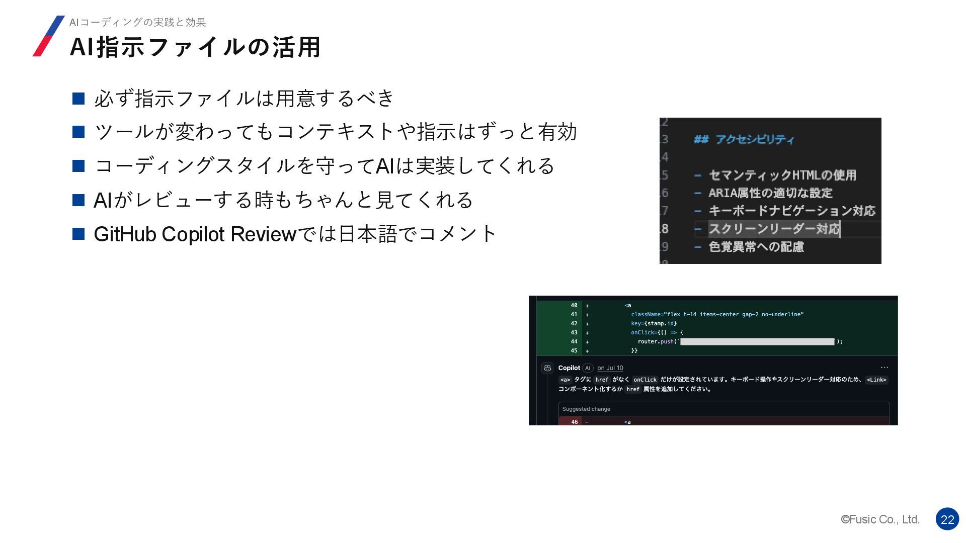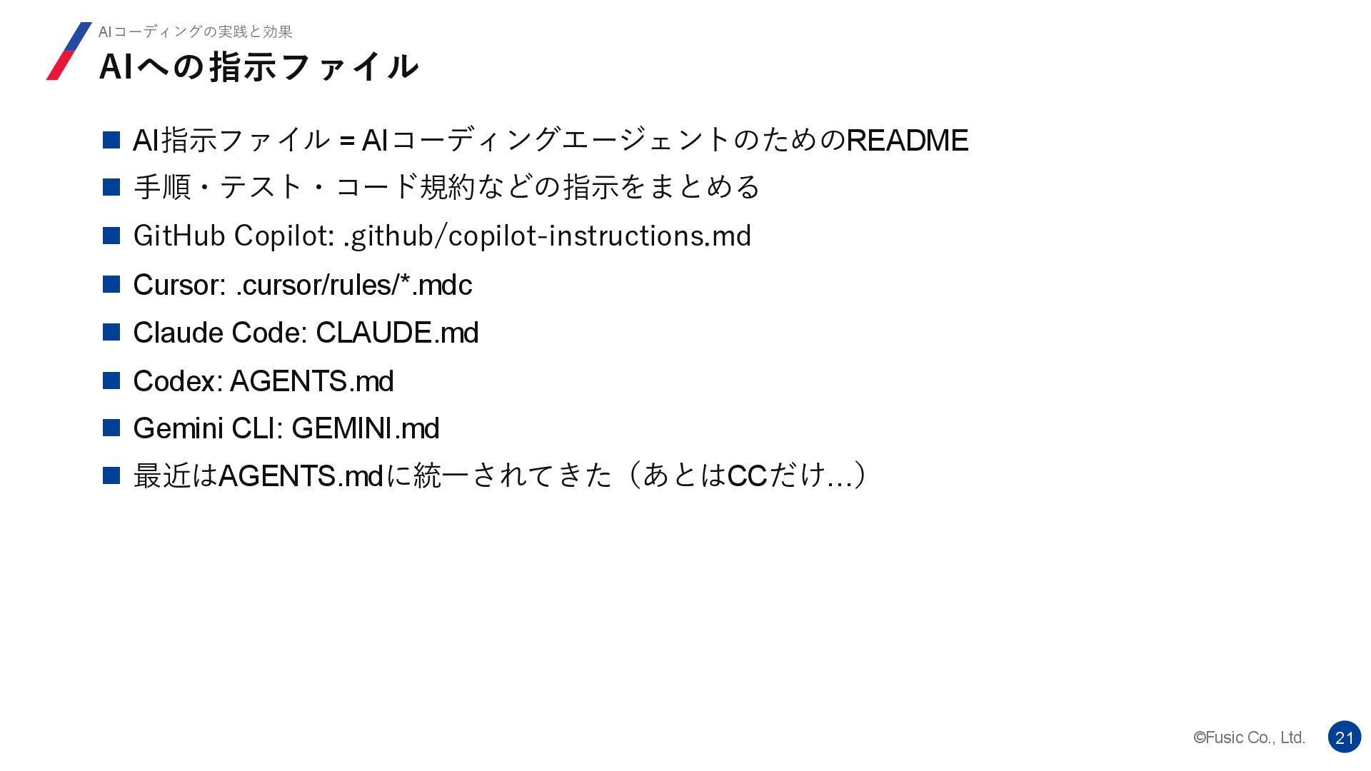©Fusic Co., Ltd. 21 AIへの指示ファイル AIコーディングの実践と効果 ◼ AI指示ファイル = AIコーディングエージェントのためのREADME