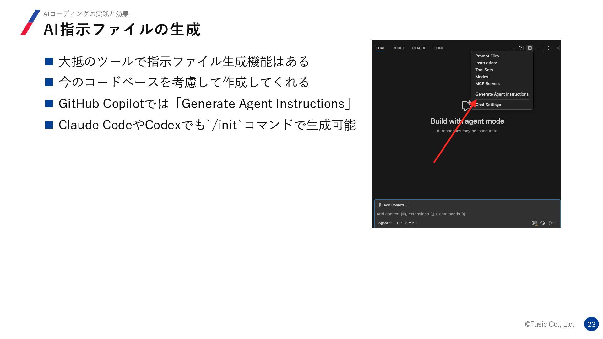 ©Fusic Co., Ltd. 23 AI指示ファイルの生成 AIコーディングの実践と効果 ◼ 大抵のツールで指示ファイル生成機能はある ◼ 今のコードベースを考慮して作成してくれる