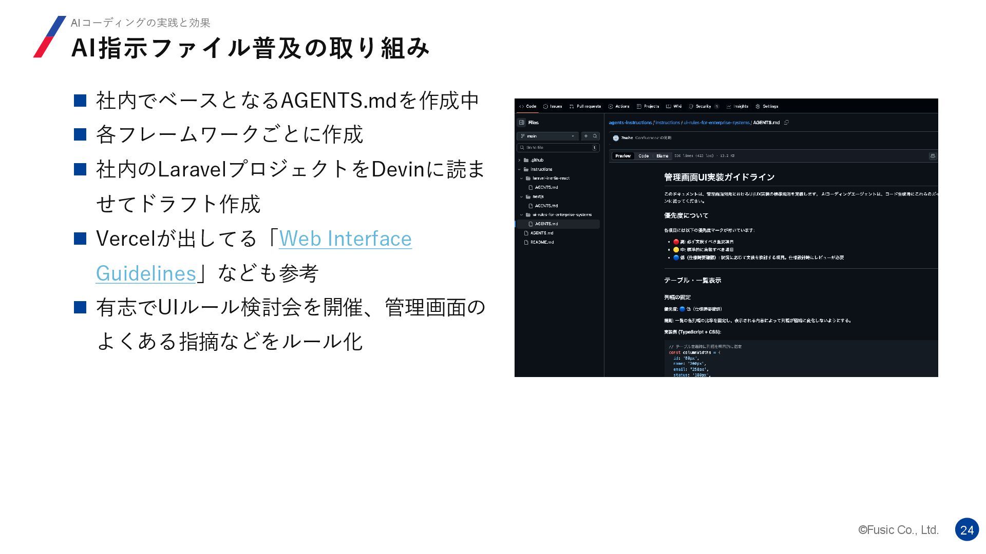 ©Fusic Co., Ltd. 24 AI指示ファイル普及の取り組み AIコーディングの実践と効果 ◼ 社内でベースとなるAGENTS.mdを作成中 ◼ 各フレームワークごとに作成
