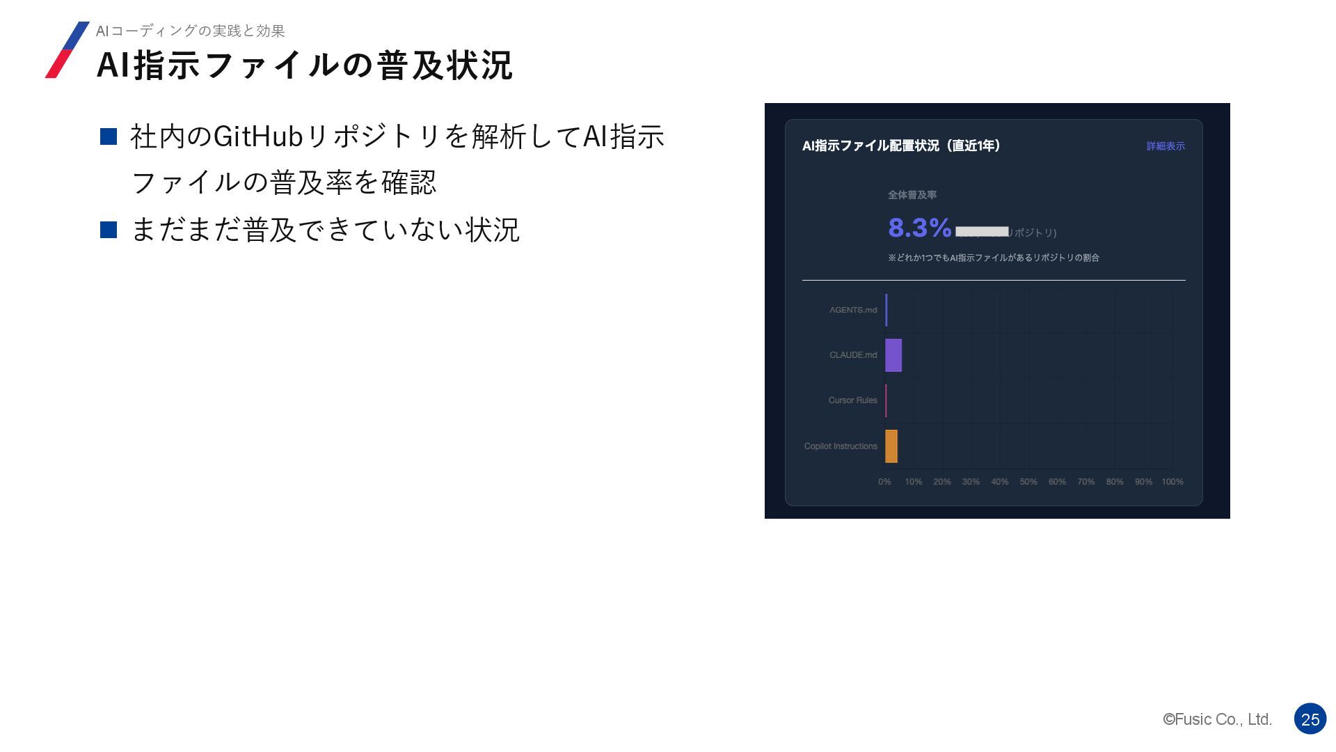 ©Fusic Co., Ltd. 25 AI指示ファイルの普及状況 AIコーディングの実践と効果 ◼ 社内のGitHubリポジトリを解析してAI指示 ファイルの普及率を確認 ◼