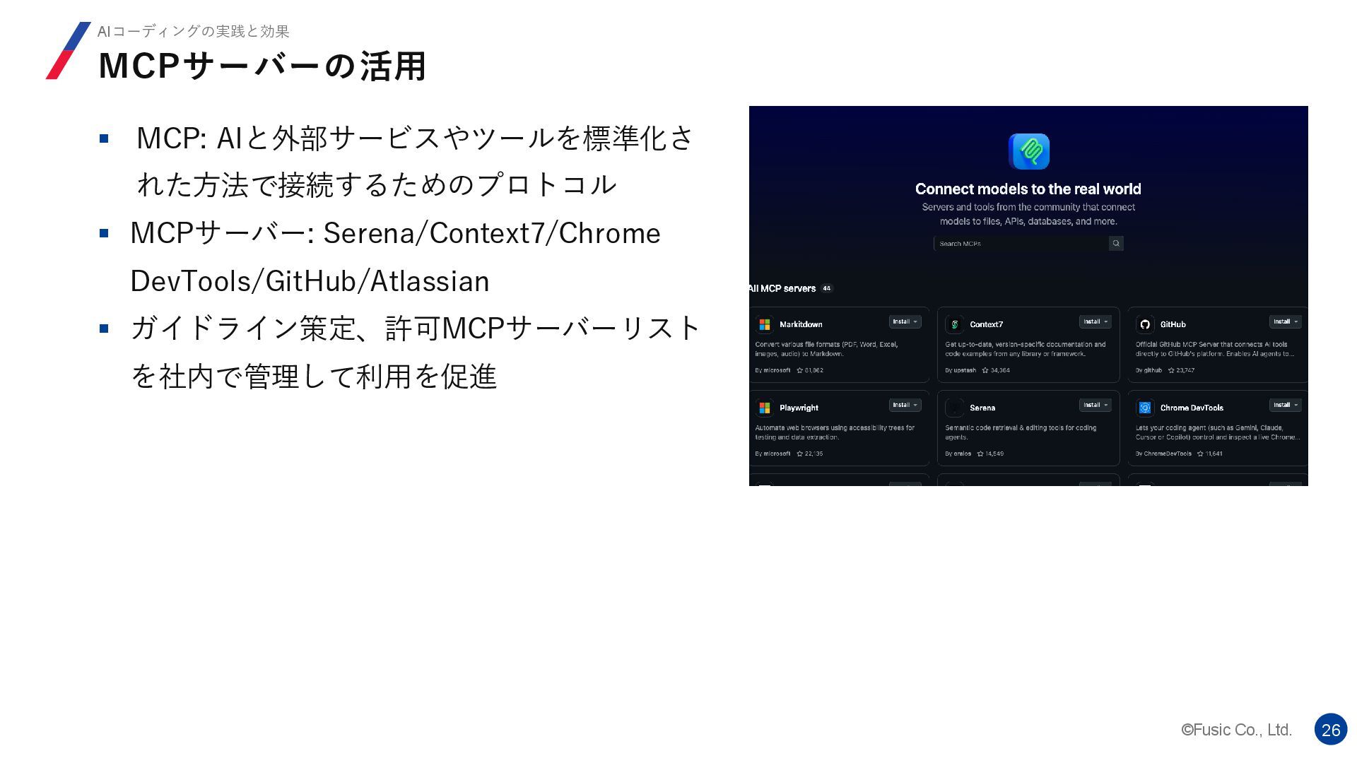 ©Fusic Co., Ltd. 26 MCPサーバーの活用 AIコーディングの実践と効果 ▪ MCP: AIと外部サービスやツールを標準化さ れた方法で接続するためのプロトコル