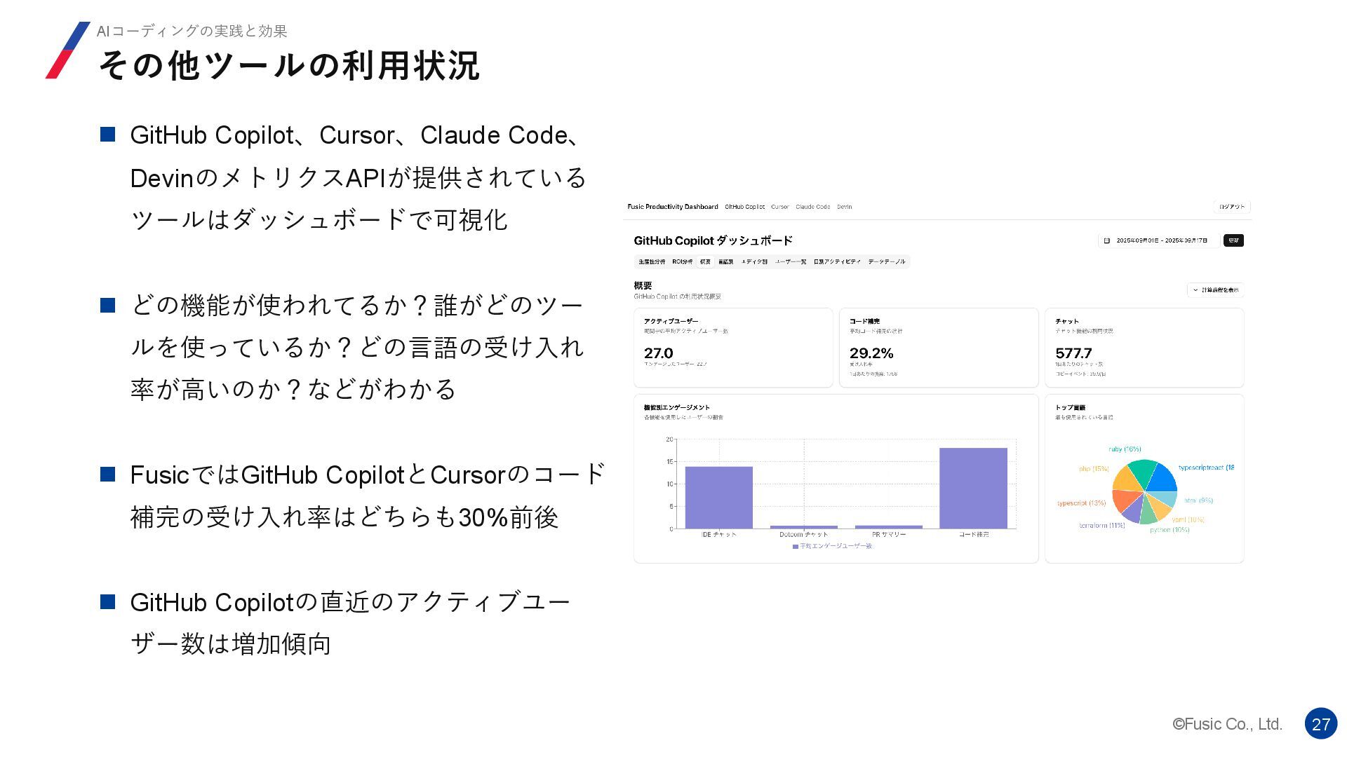 ©Fusic Co., Ltd. 27 その他ツールの利用状況 AIコーディングの実践と効果 ◼ GitHub Copilot、Cursor、Claude Code、