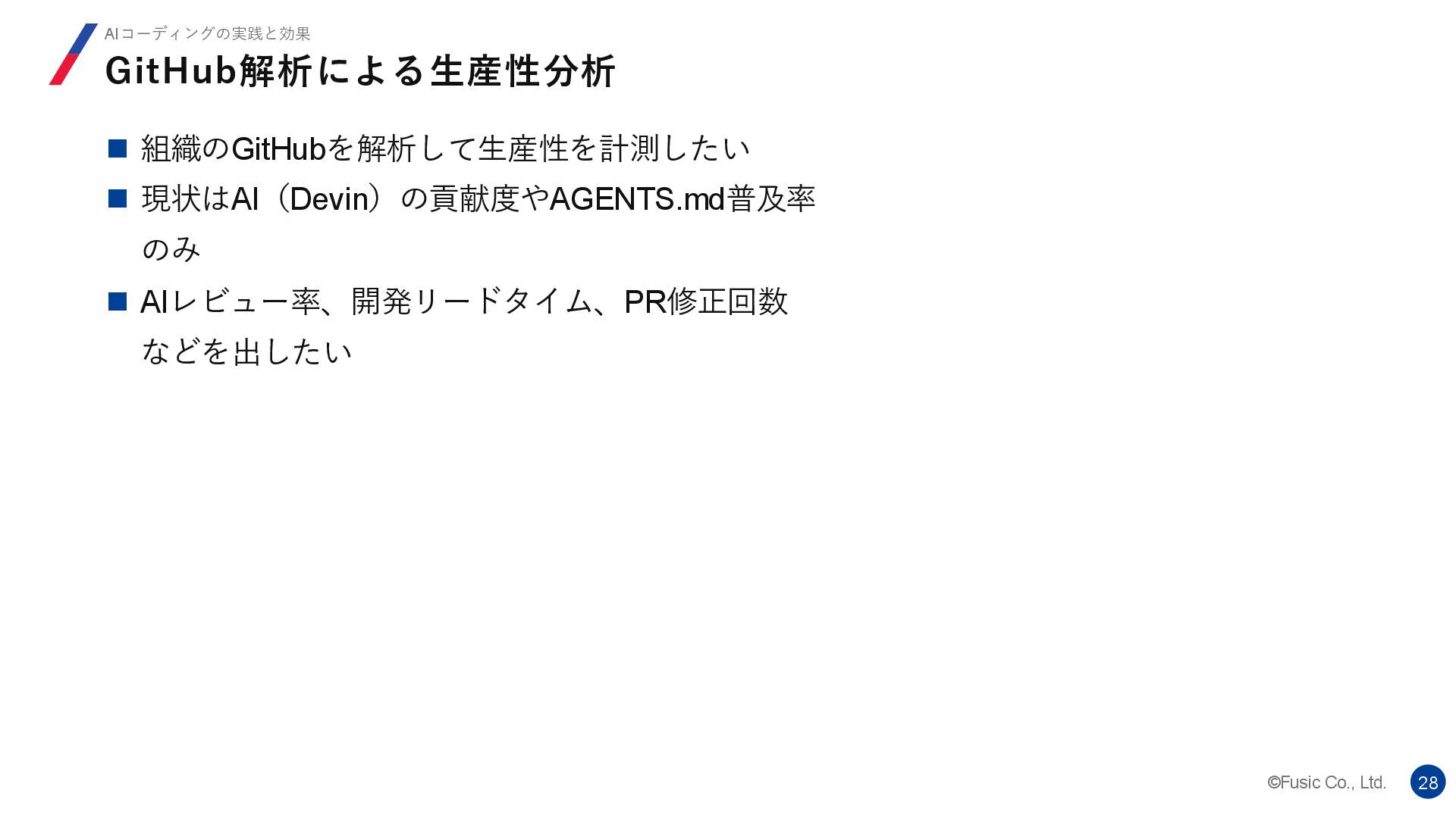 ©Fusic Co., Ltd. 28 GitHub解析による生産性分析 AIコーディングの実践と効果 ◼ 組織のGitHubを解析して生産性を計測したい ◼ 現状はAI(Devin)の貢献度やAGENTS.md普及率