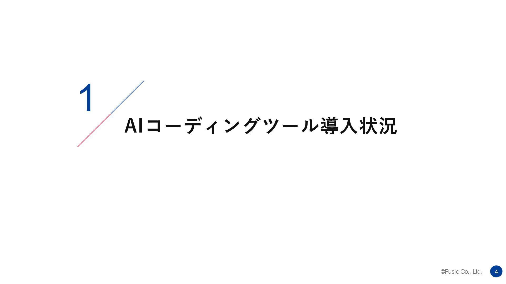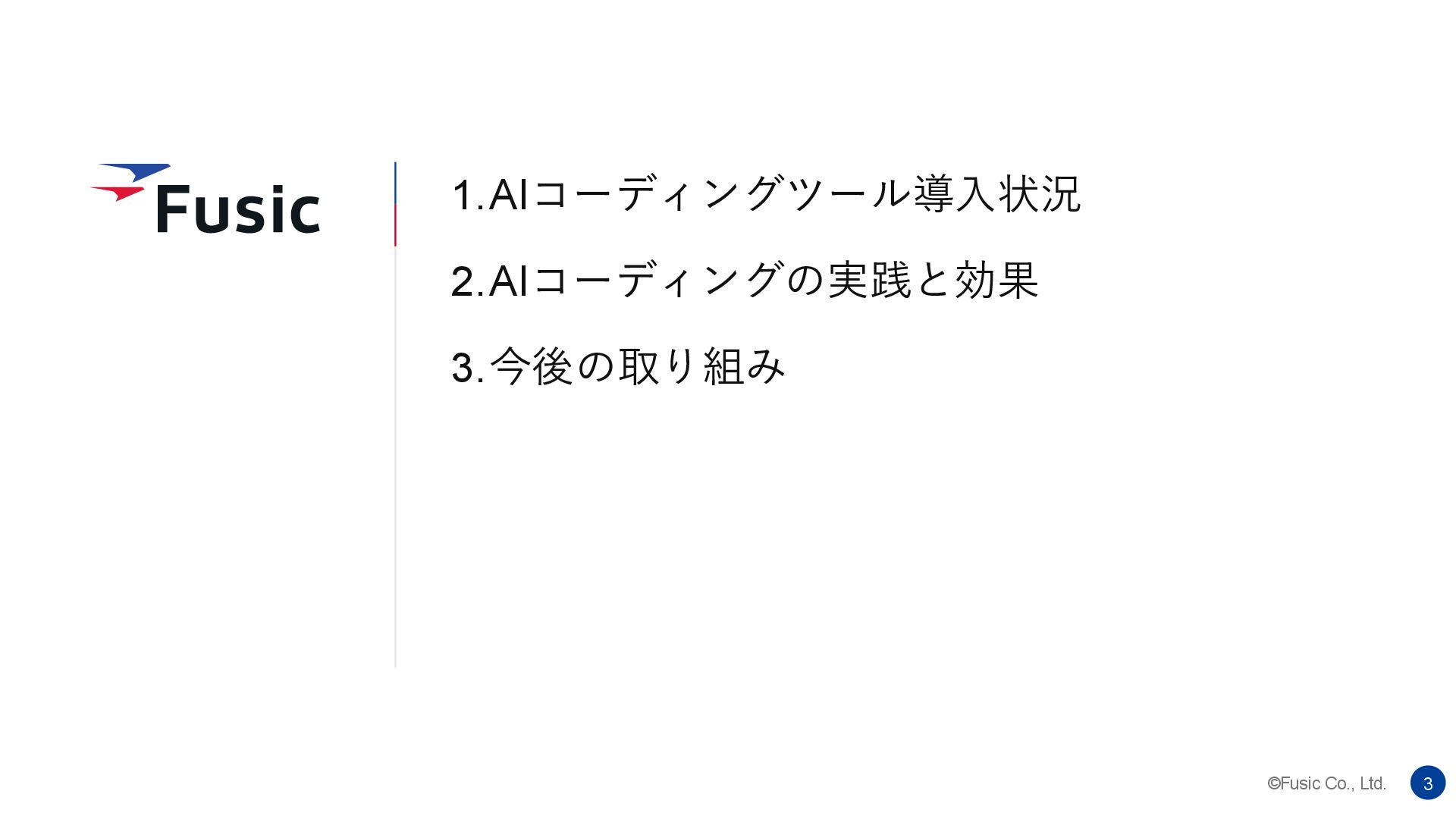 ©Fusic Co., Ltd. 3 1.AIコーディングツール導入状況 2.AIコーディングの実践と効果 3.今後の取り組み