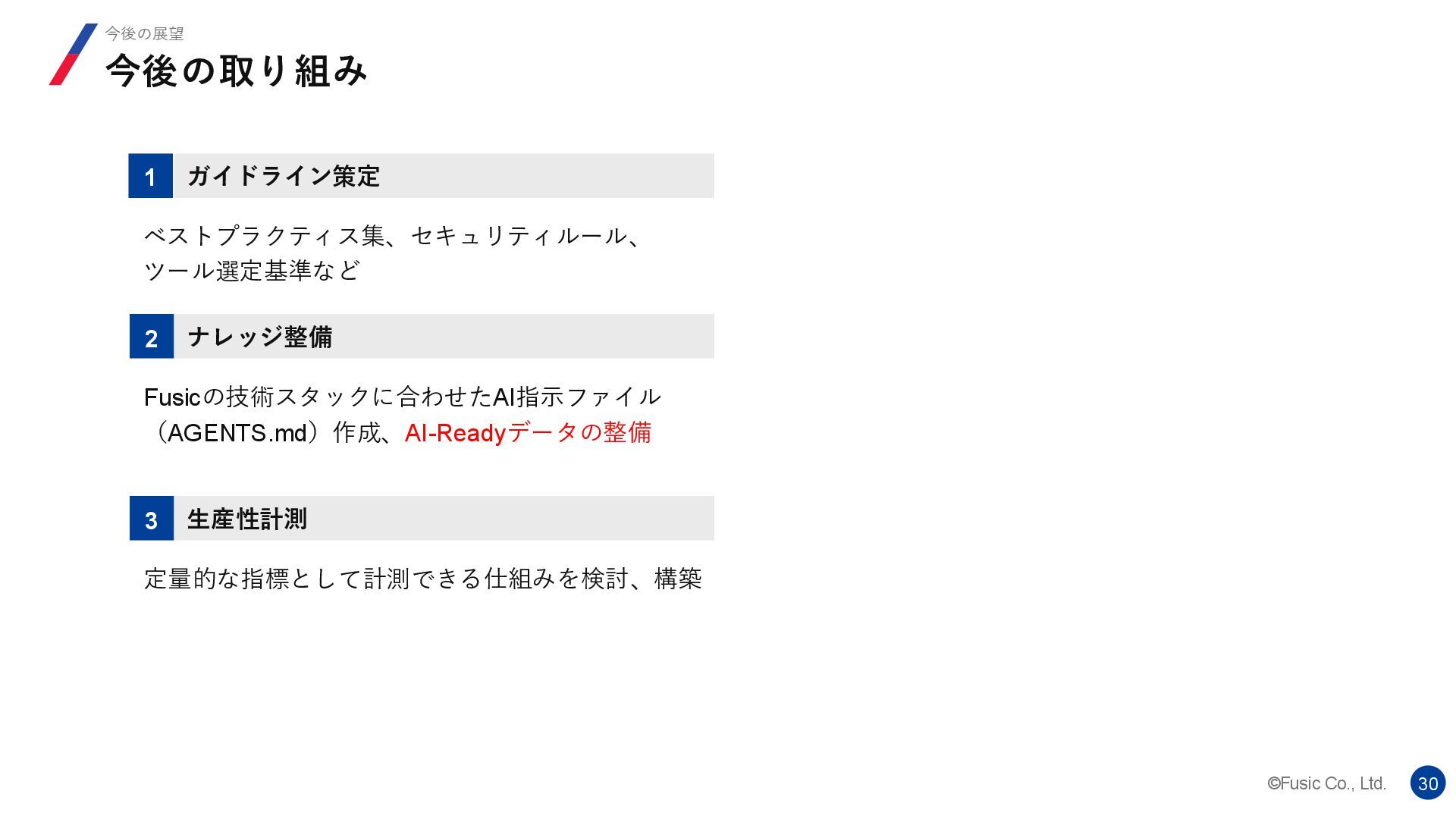 2 ナレッジ整備 Fusicの技術スタックに合わせたAI指示ファイル (AGENTS.md)作成、AI-Readyデータの整備 3 生産性計測 定量的な指標として計測できる仕組みを検討、構築