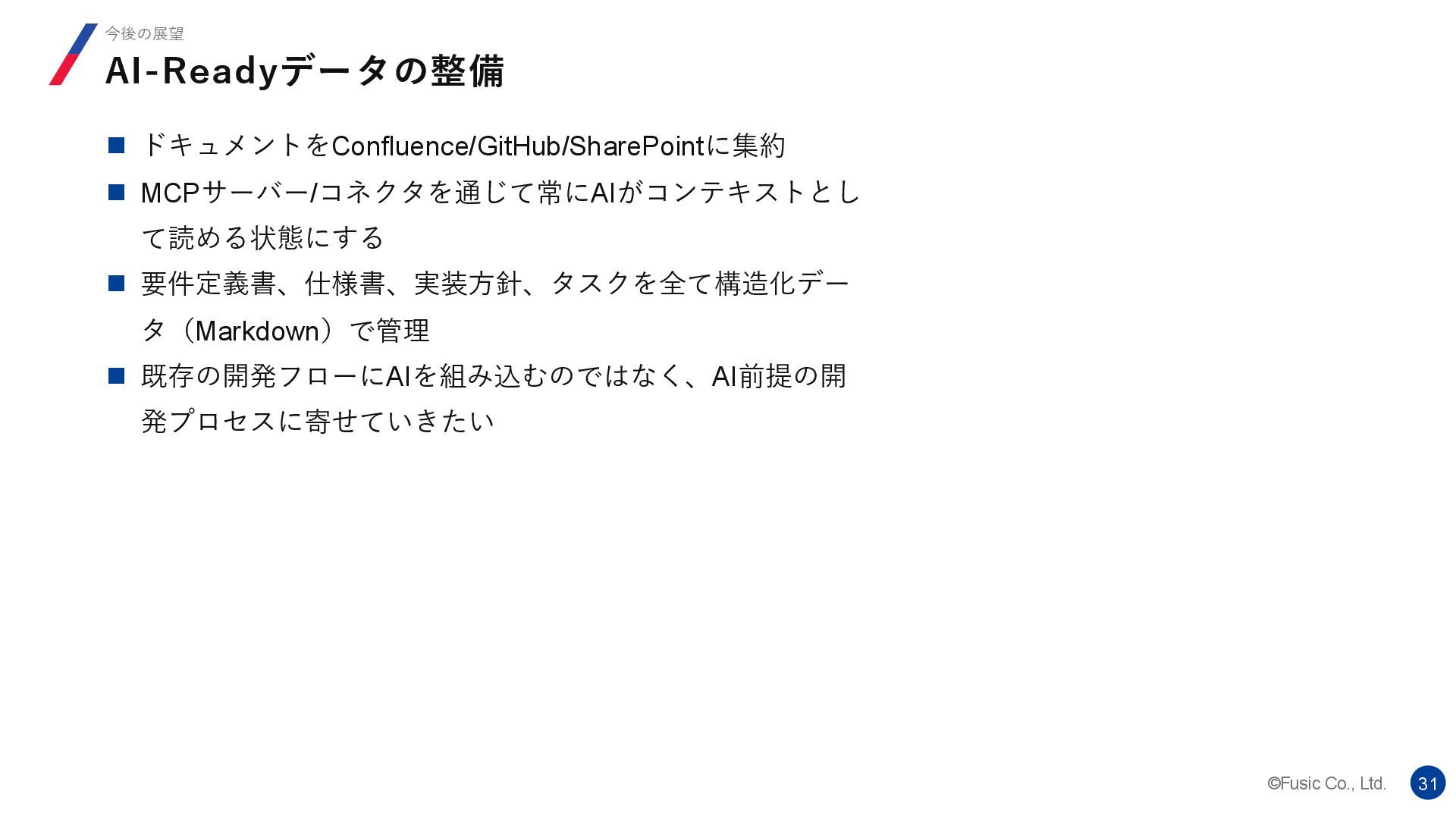 ©Fusic Co., Ltd. 31 AI-Readyデータの整備 今後の展望 ◼ ドキュメントをConfluence/GitHub/SharePointに集約 ◼ MCPサーバー/コネクタを通じて常にAIがコンテキストとし
