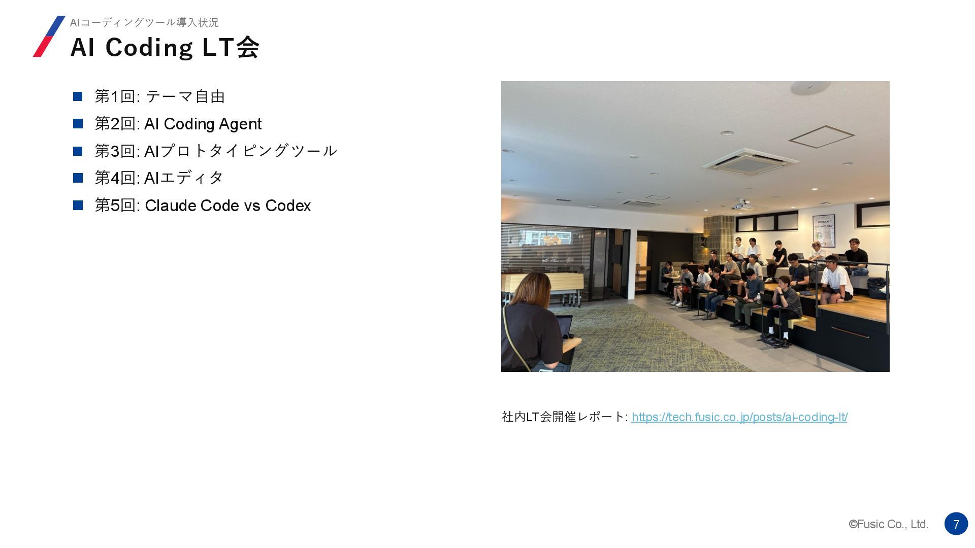 テーマ自由 ◼ 第2回: AI Coding Agent ◼ 第3回: AIプロトタイピングツール ◼ 第4回: AIエディタ ◼ 第5回: Claude Code vs Codex 社内LT会開催レポート: https://tech.fusic.co.jp/posts/ai-coding-lt/