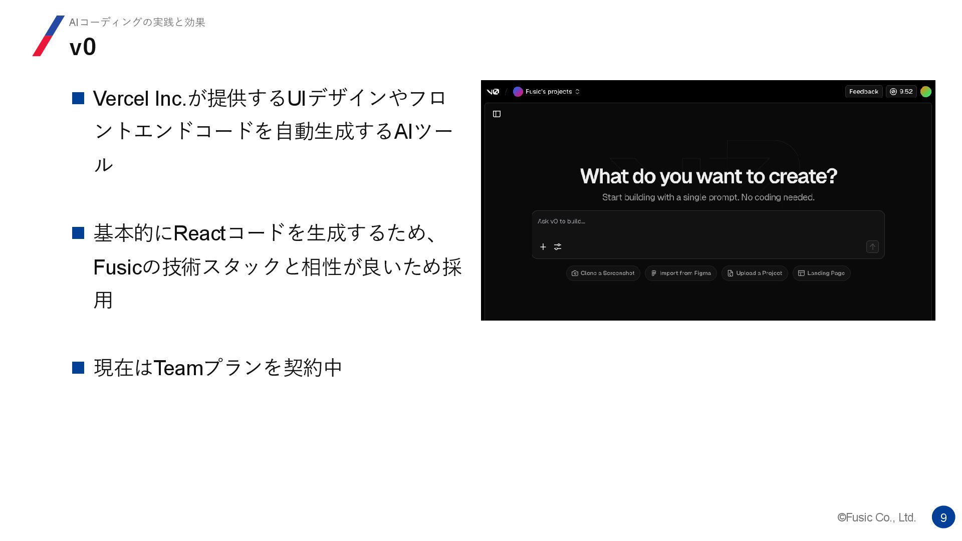 ©Fusic Co., Ltd. 9 v0 AIコーディングの実践と効果 ◼ Vercel Inc.が提供するUIデザインやフロ ントエンドコードを自動生成するAIツー